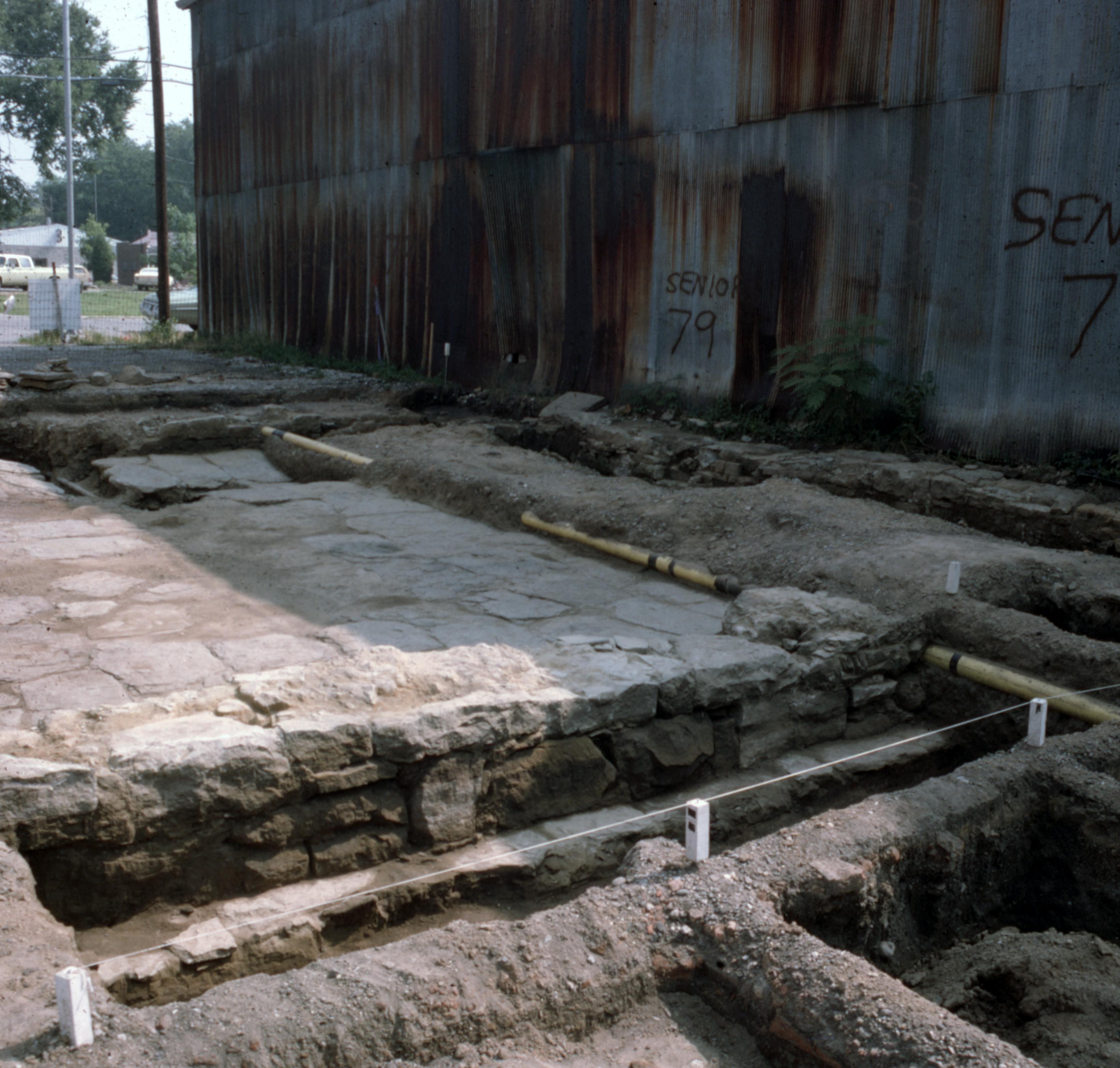 Stone Warehouse: The Stone Warehouse was located behind the 602 Main Street building, which is now under a parking plat. This photo shows the archaeological excavation of the Stone Warehouse floor facing toward the north. The location of The old Gypsy Girl Livery stable can be seen on the right side of the photo, this building is no longer present in July 2021.