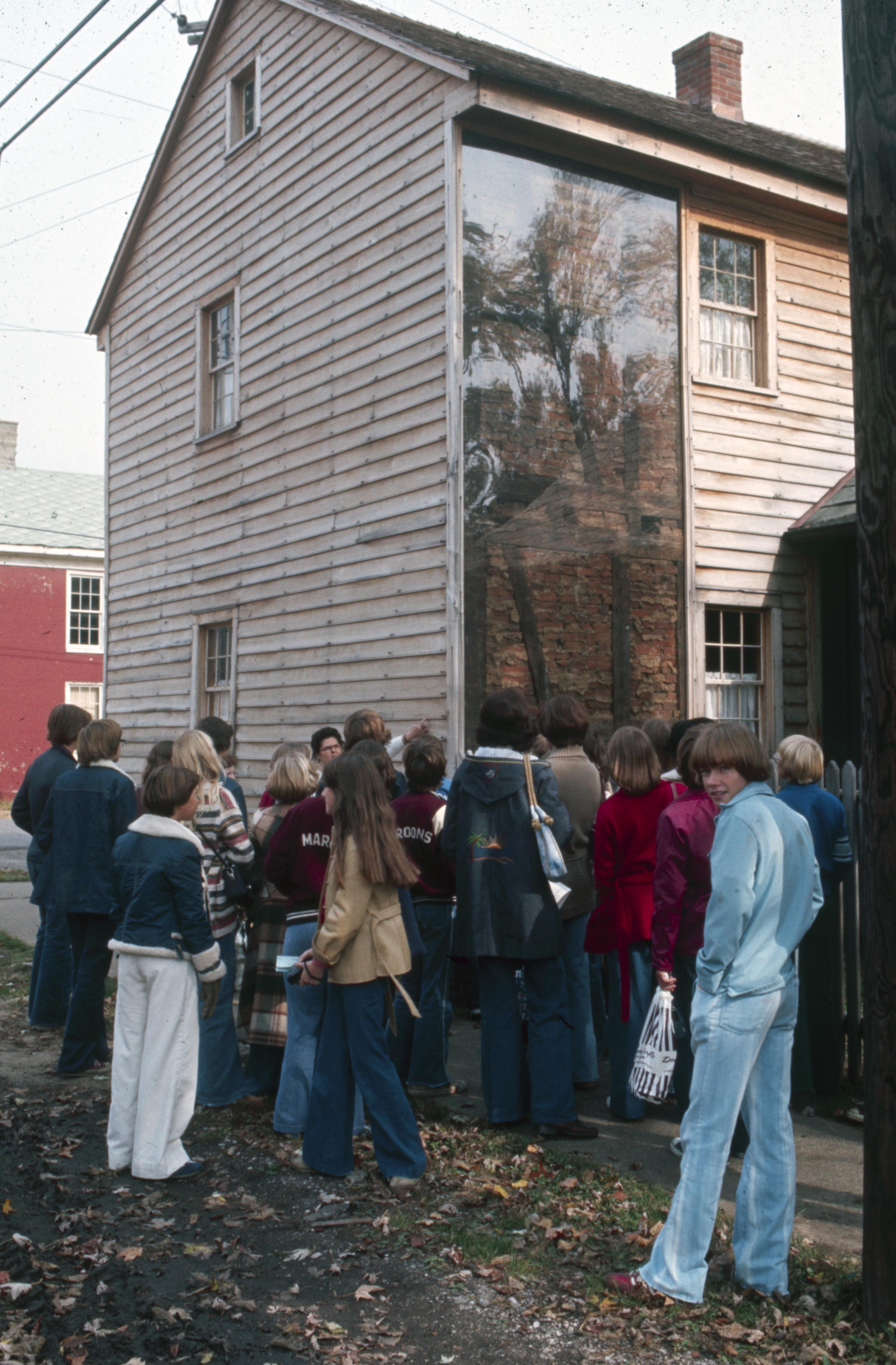 Autrieth House: This house is located at 605 Tavern Street and was constructed in 1855. A group of visitors are looking at the brick filled timber frame of the original 1855 construction on the southwest corner of the house.