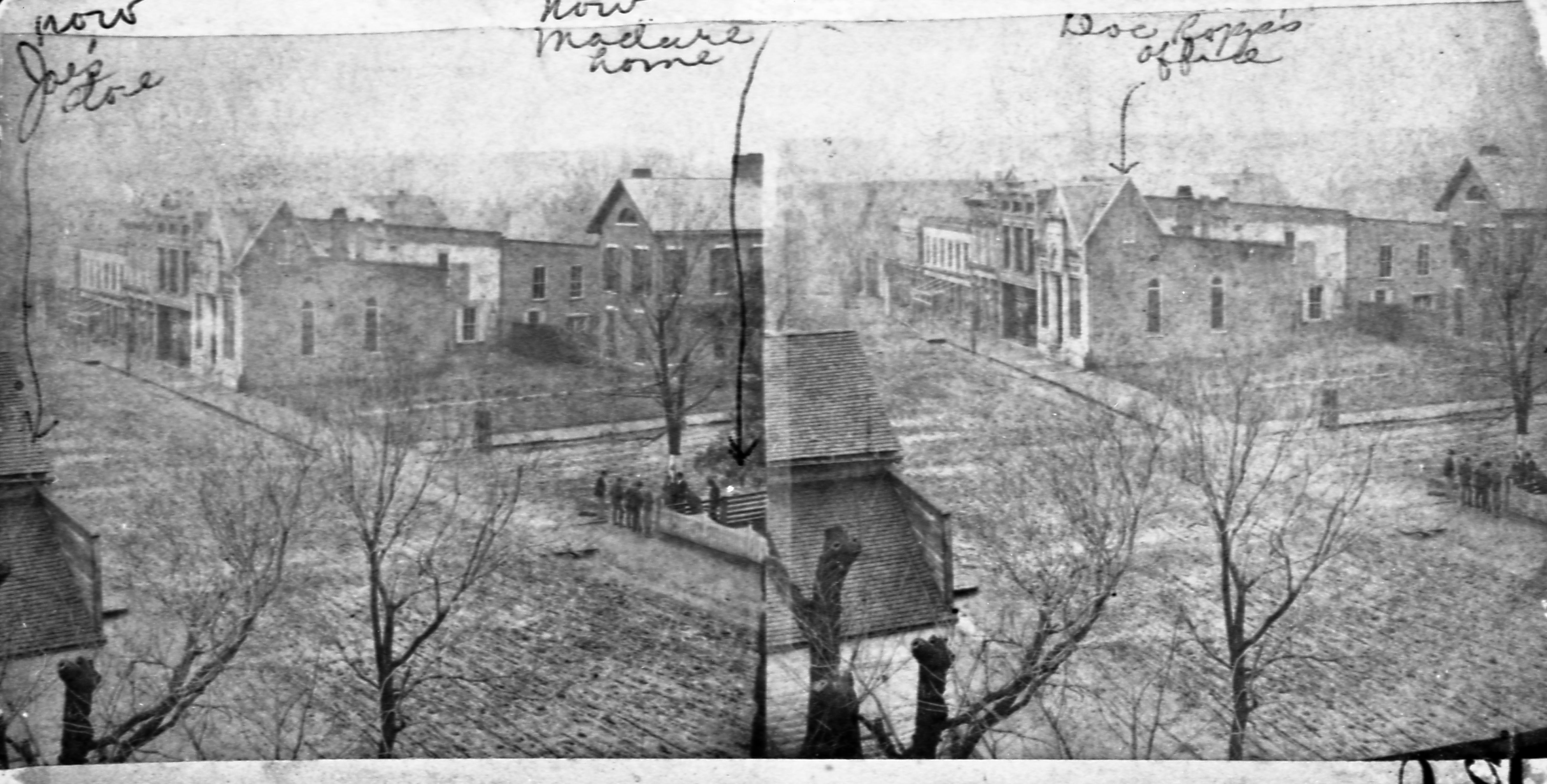 Transparencies and Negatives Collection: Historic photographs. This stereoscopic photo was probably taken from the upper floor of the Fretageot Store, aka Rappite Dormitory No. 2. It shows Main Street facing toward the south.