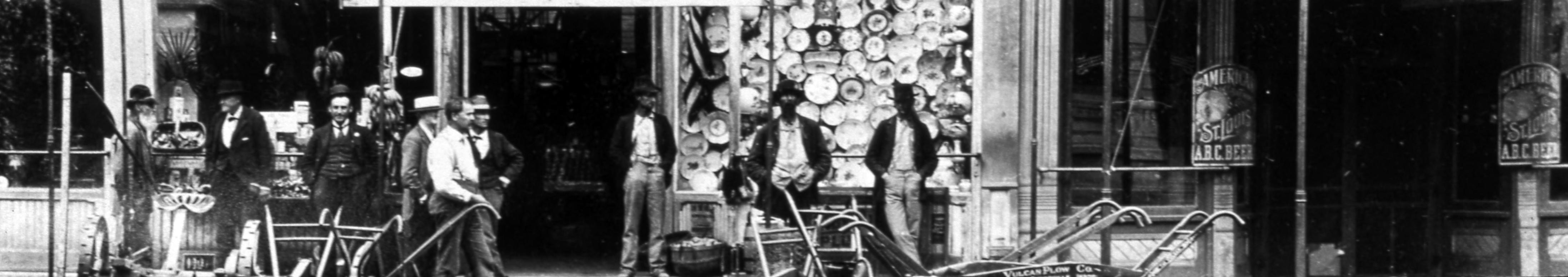 E. F. Owen and Company Store: Located at 502 Main Street, on the southeast corner of Main and Church. This grocery store had been at this location since before 1888 and had persisted until sometime in the late 1890s. This plat belonged to Owen and Company on the 1869 Plat Map and the other side of this building did indeed house a hardware and agricultural implements store. In all probability, this was the location of E. F. Owen and Company. By the mid to late 1890�s the Owen grocery store had been replaced with a clothing store, which only lasted a short time and was in turn replaced by Armstrong�s Place Saloon by 1907 at the latest. This historic photo shows a group of men standing around outside of Owen's Shop. To the right of Owen's Shop is an unknown saloon, which was not on the Sanborn Maps until 1899, thus the photo must have been taken after 1893 at some point after the saloon replaced the pharmacy in that building.