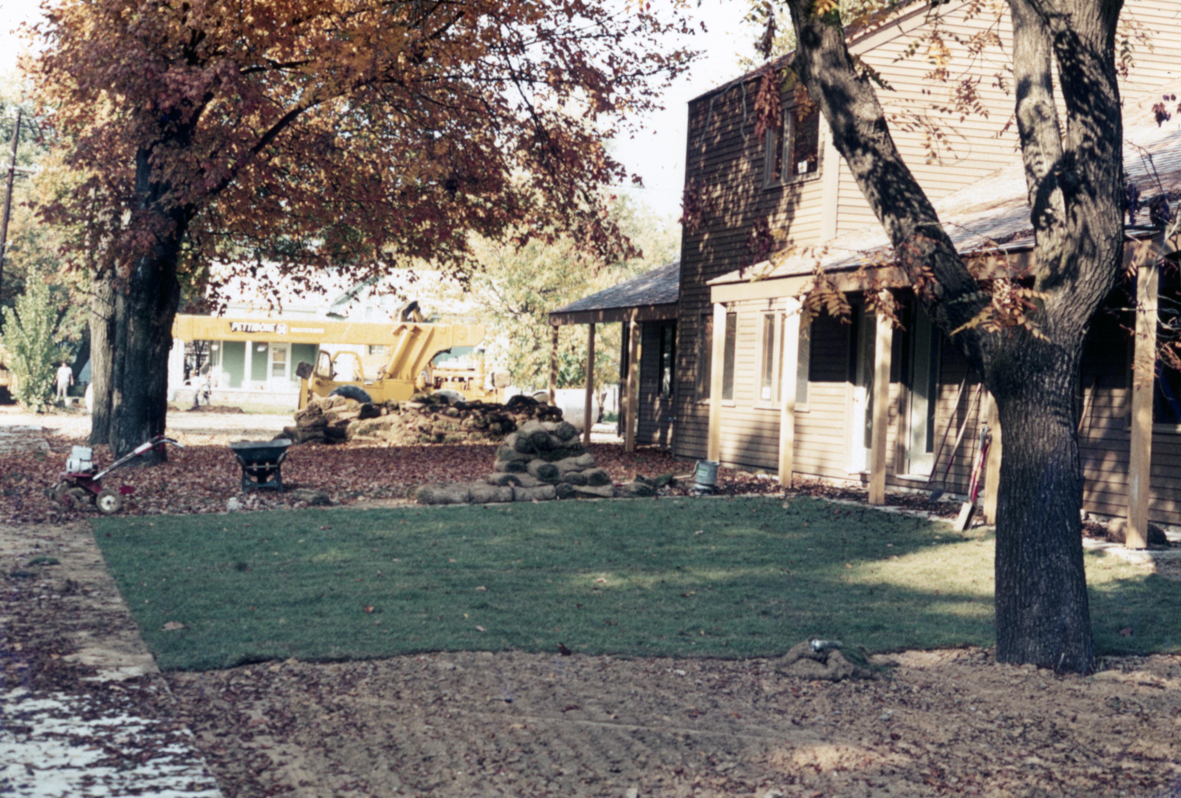 Lanark Development Collection: Construction of 820 Main Street New Harmony Indiana. Laying of sod at the front of the building facing Main Street.
