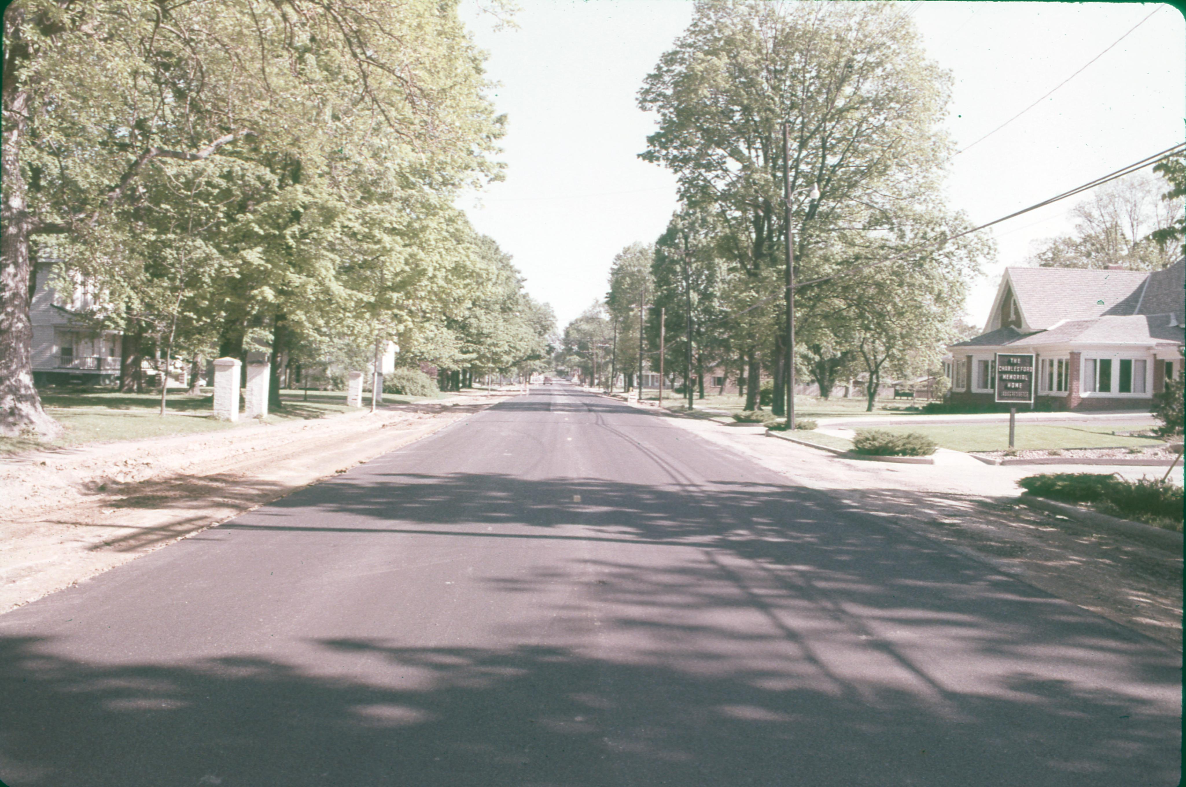 Streets Collection: Main Street. This photo was taken on Main Street facing north. The Charles Ford Memorial Home can be seen on the right side of the photo. The brick/stone fencing (probably for wrought iron) posts for the property at 831 Main Street can be seen on the left. Both The Charles Ford Memorial Home and 831 Main Street are still present as of 2020.