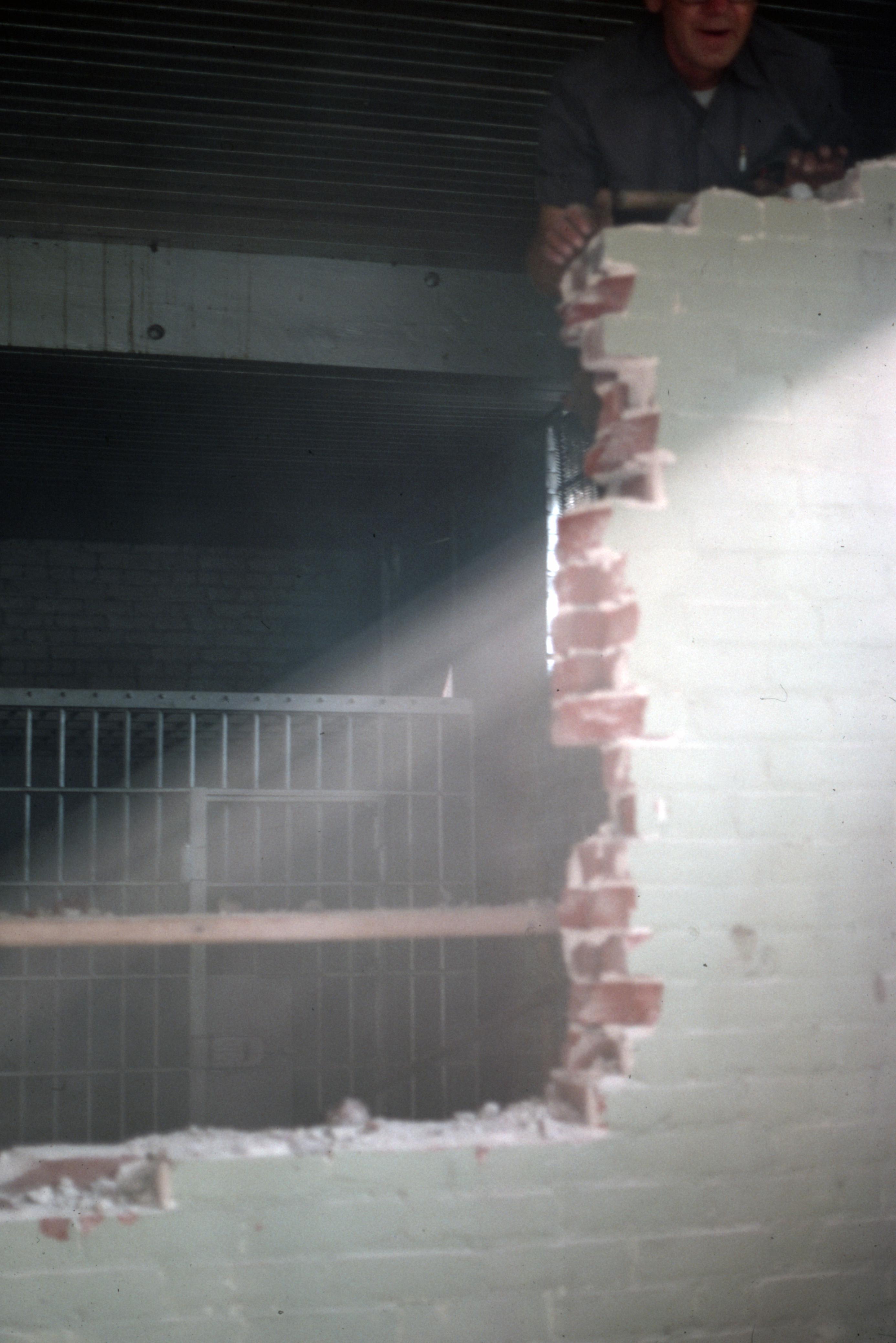 The City Building: This building is Located at 608 Main Street and housed the firehouse on the ground floor and City Hall on the second floor. An interior view of the old City Building under reconstruction and refurbishment. An old jail cell can be seen behind a construction worker.
