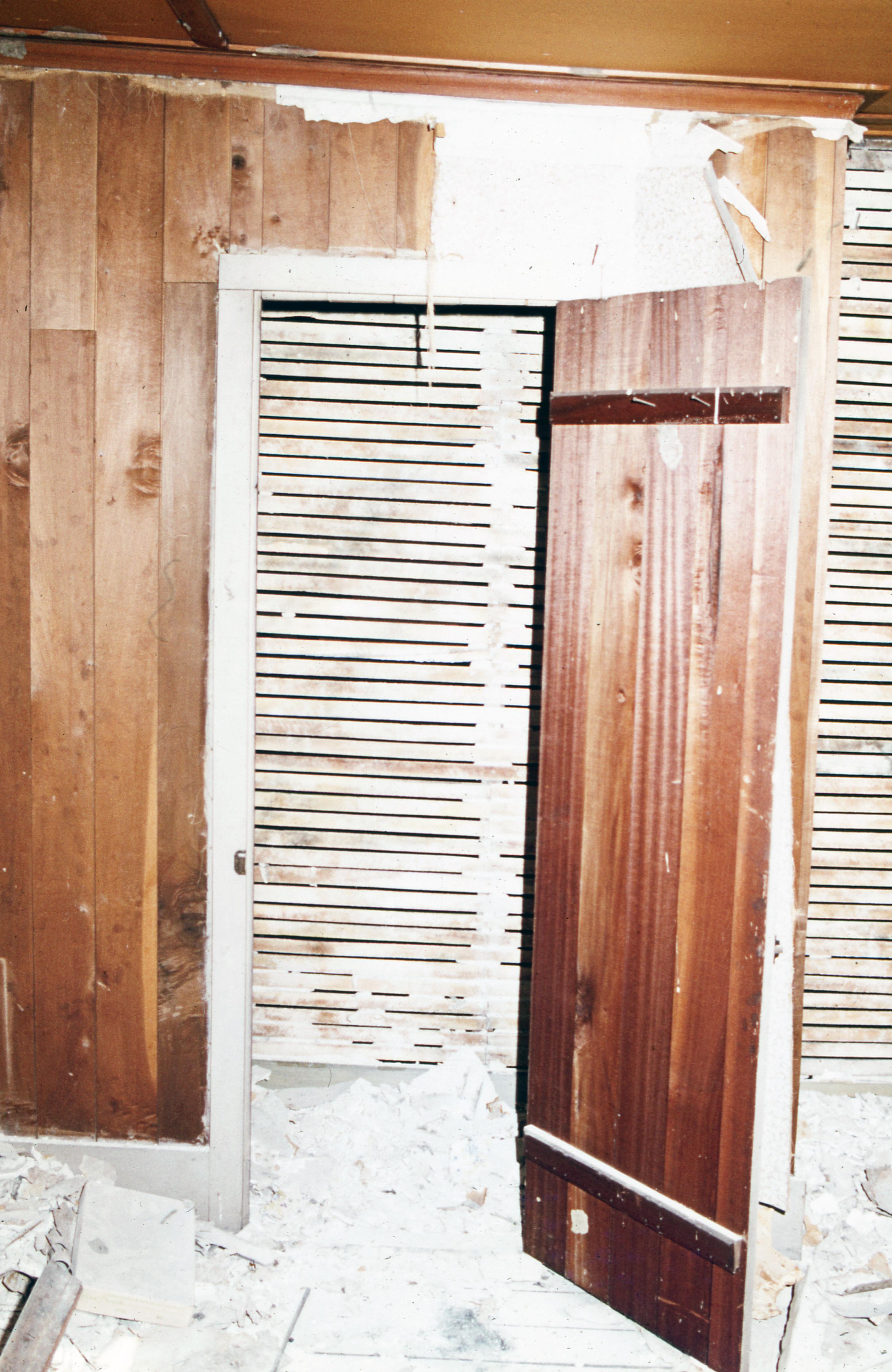 Rhodes House: This house is located at 611 Arthur Street and was present by at least 1907. The Rhodes House had sat abandoned for many years before restoration work was undertaken. This photo shows the walls which have partially been stripped back to the original laths and studs.