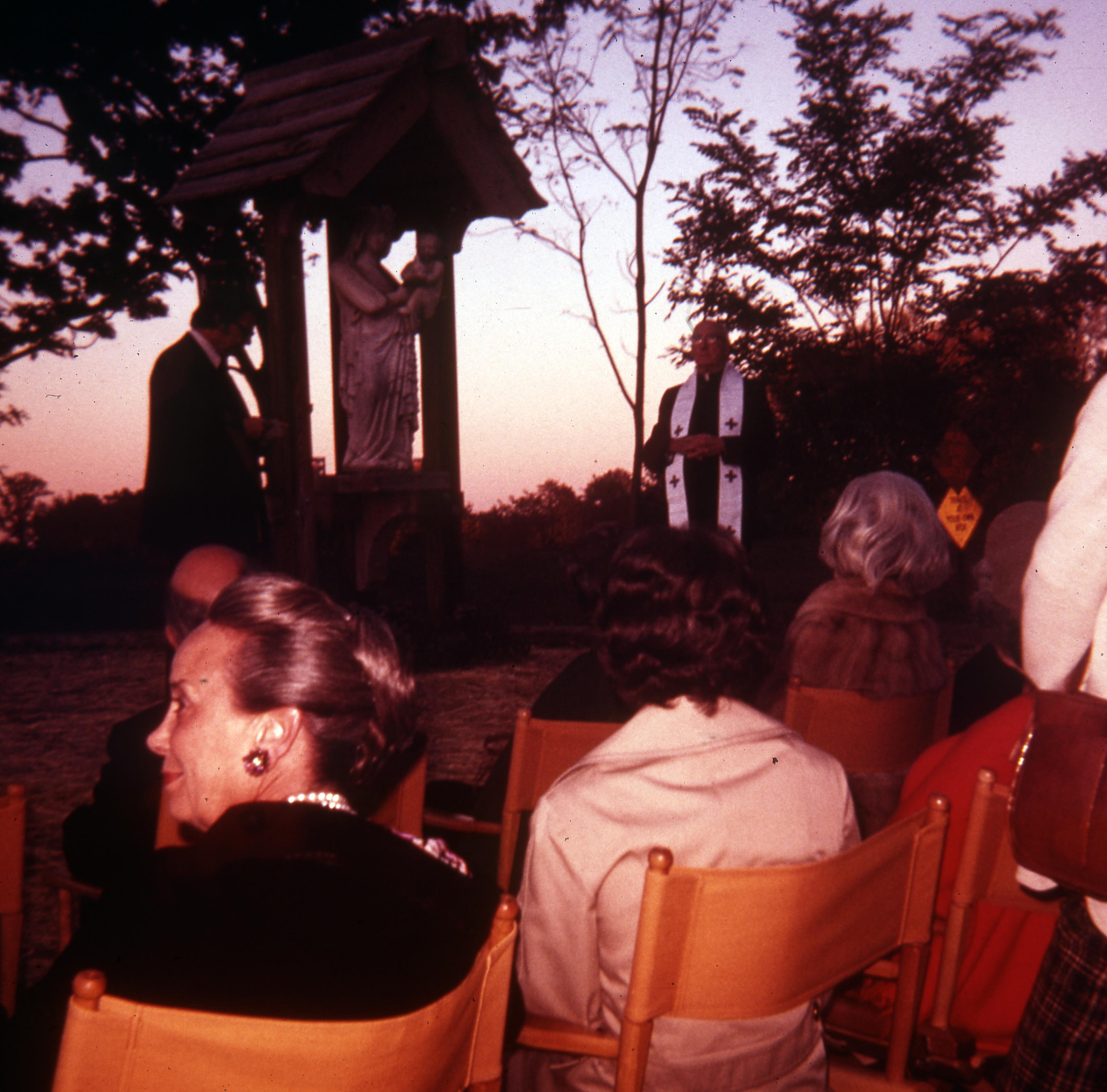 Dedication of the Our Lady Queen of Peace Shrine also known as Wayward Shrine is located on in front of The Roofless Church. The shrine was created in France in the 15th century and is dedicated to the Trappist Monk Thomas Merton. This image is part of The Lois Muller Collection which is part of the Historic New Harmony Slide Collection.