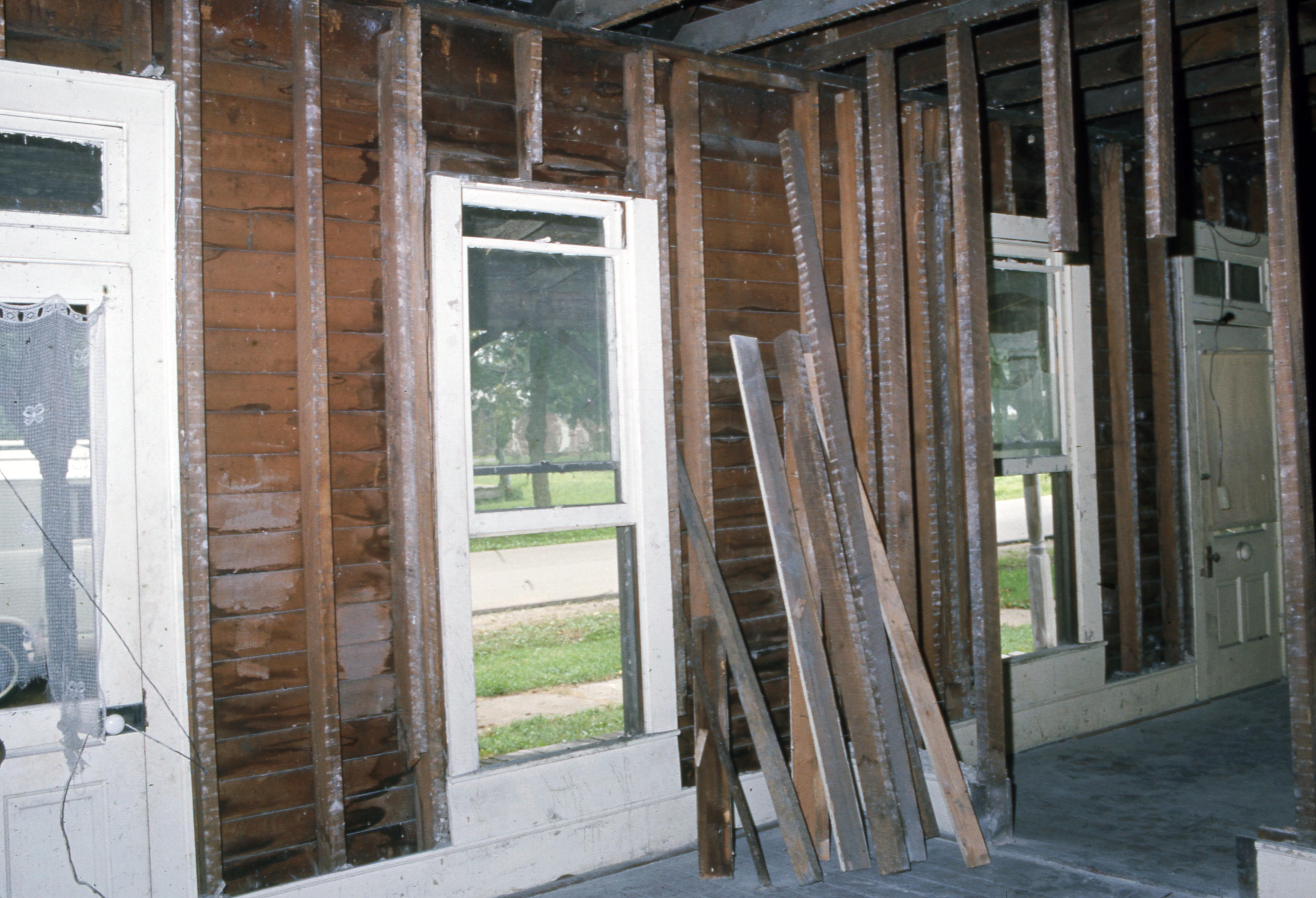 Patterson House: Located at 682 Arthur Street and built in 1850. The old front of the house as seen from the interior. The old porch, later demolished, and Steam Mill are visible through the door and windows in this photo.