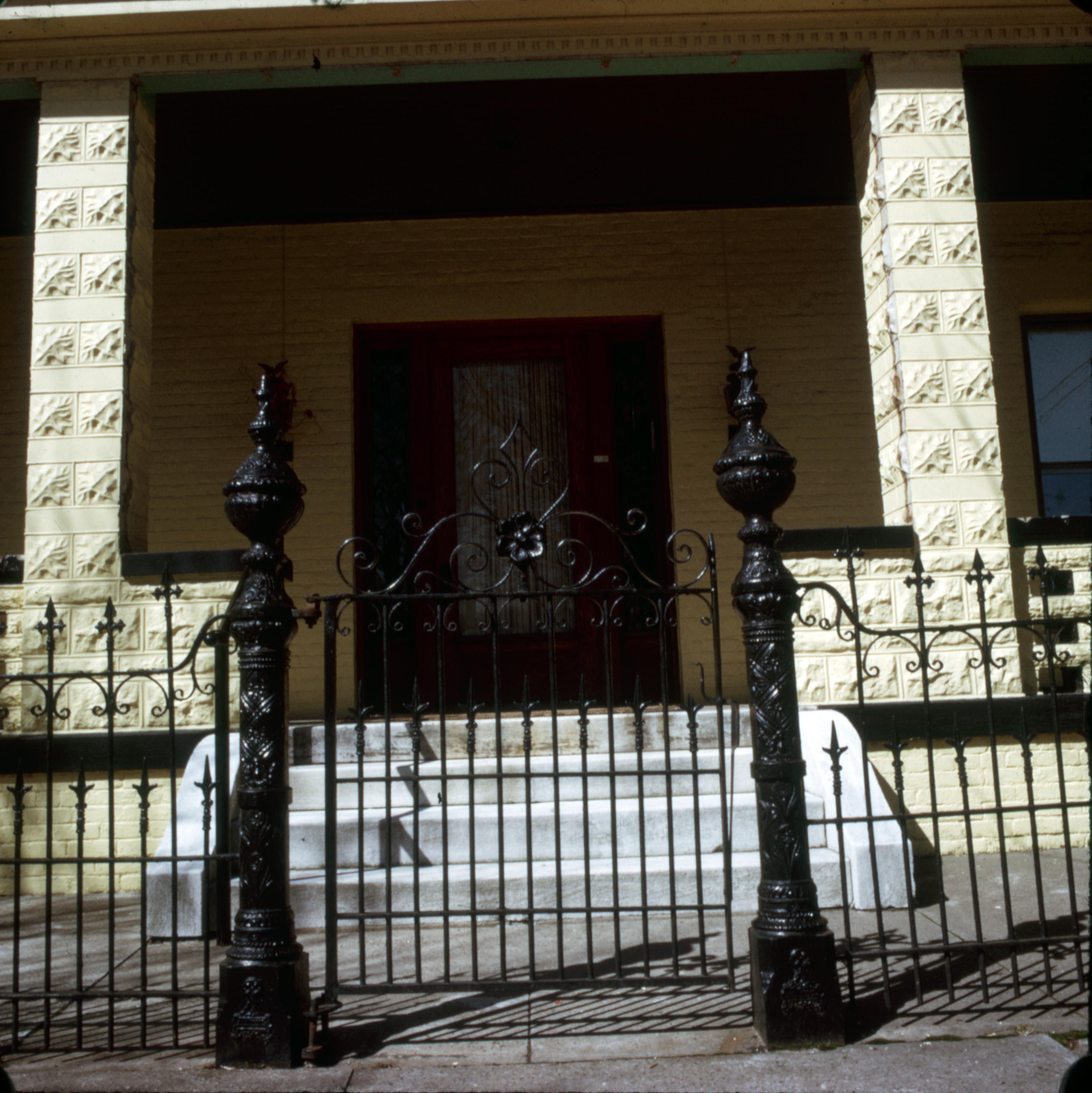 Schnee House: This photo is of the second Schnee home located at 603 West Street and was constructed in 1876. The first Schnee home was constructed during the Rappite occupation of the town, the Schnee brothers having moved to the town from the Quaker colony in Pennsylvania, and that house was located at 517 Tavern Street. The Gypsy Girl Livery Stable was later constructed behind that home. This is the cast iron gate and fence surrounding the house. The old concrete porch has not yet been replaced in this photo.