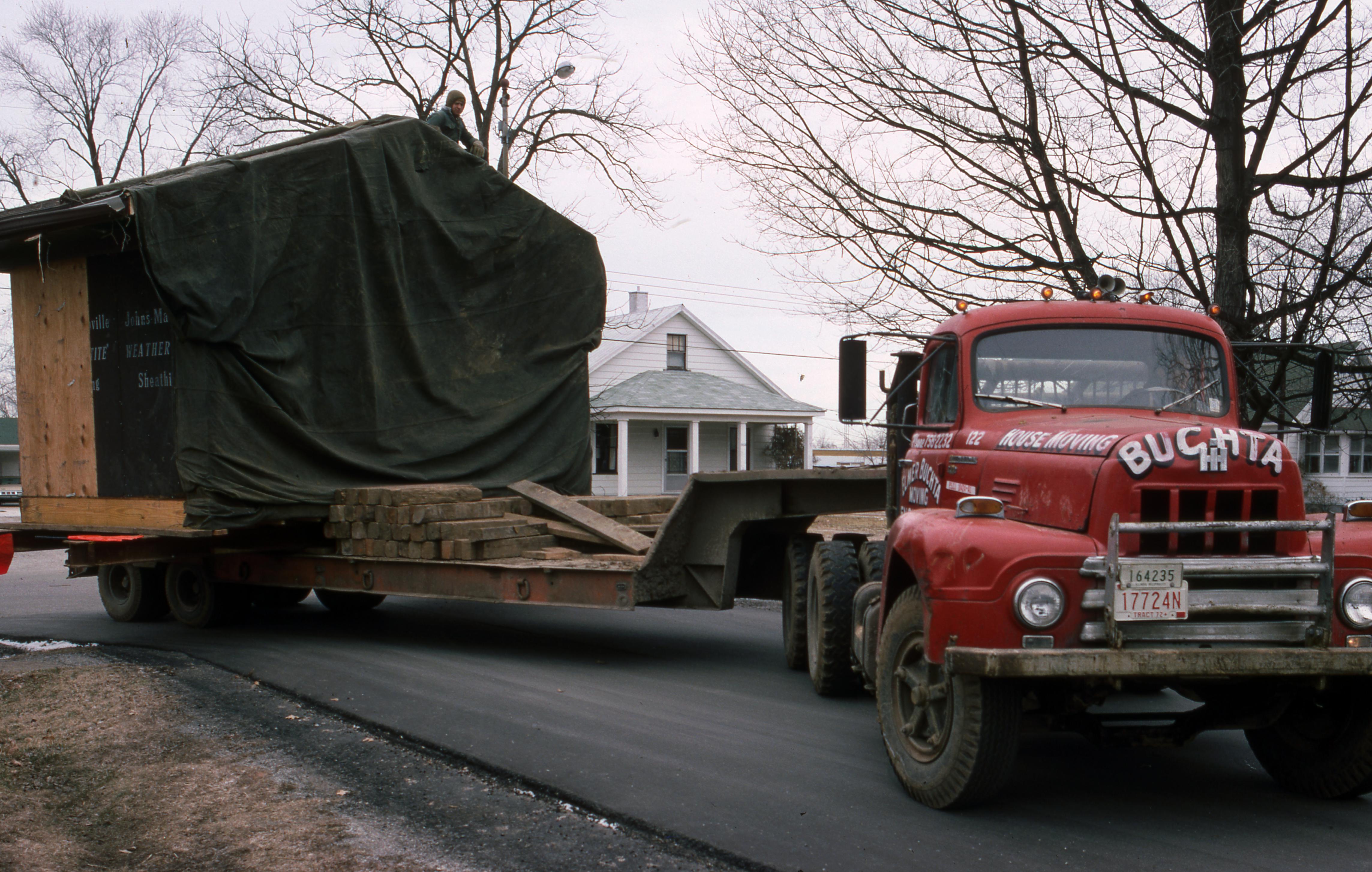 Bauer House: This house was originally located on the north side of North Street in town block 2 C/E. It was moved to the new location at 518 First Street before construction on the Atheneum had begun. Elmer Buchta Moving Engineers was contracted for this and many other building moves during the 1970s. This photo is of the back part of the house, which was moved as a separate part from the main house, enroute to the new plat at 518 First Street.