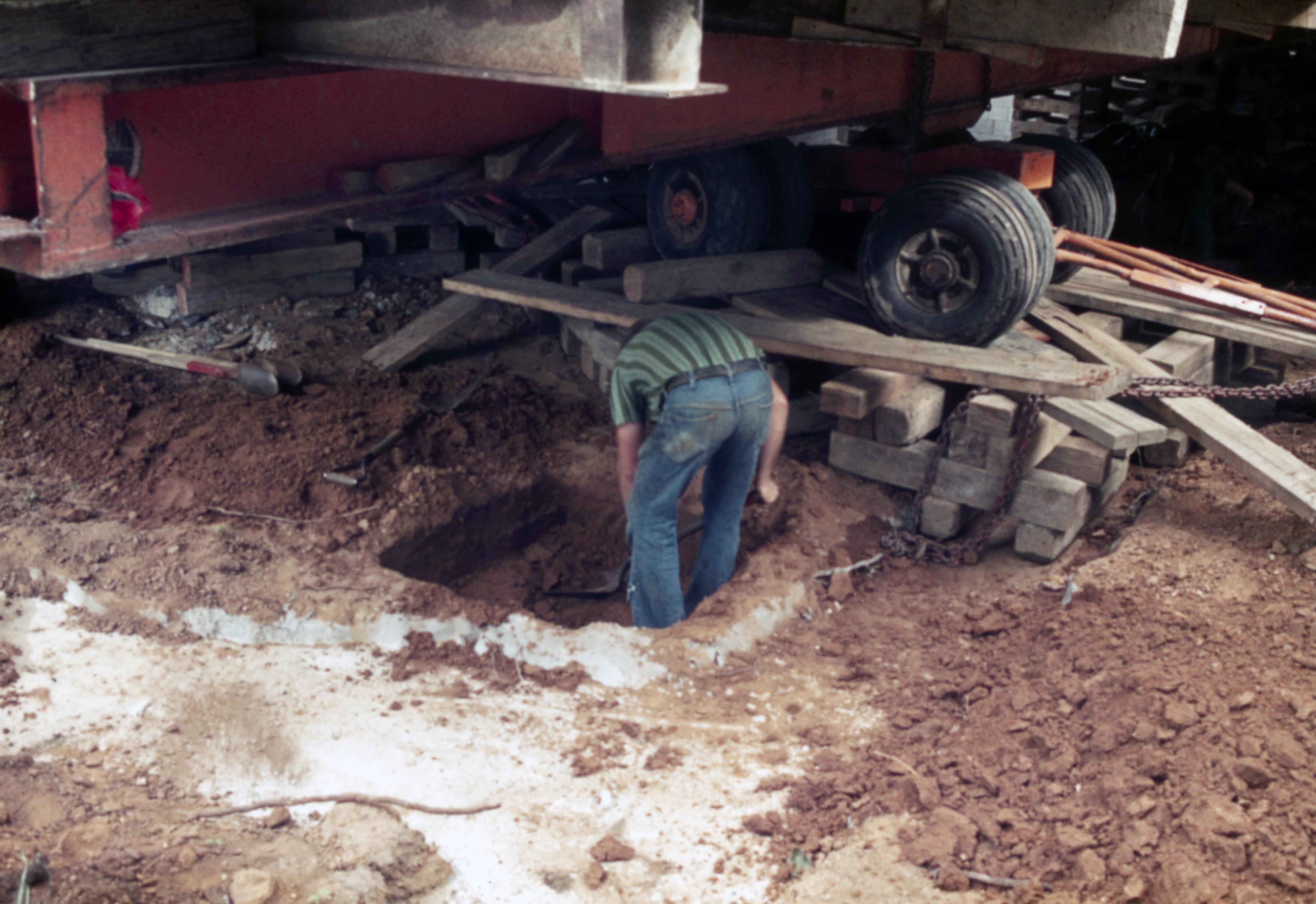 Barrett House Move: This house was originally located at 1826 Main Street but was then moved to 604 South Street during the Lanark Construction. Elmer Buchta were the movers. Workmen underneath the house working on the new foundations.