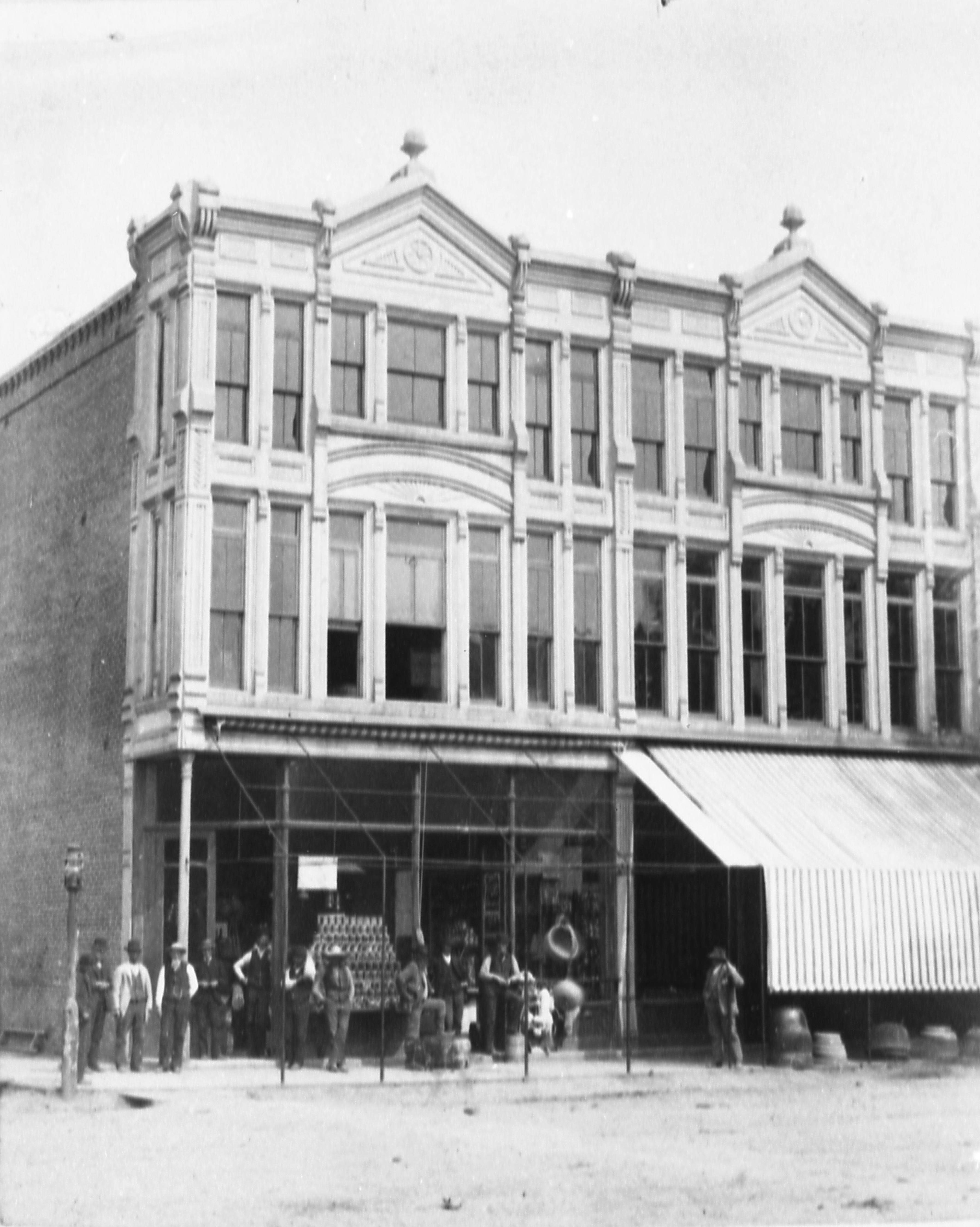 Transparencies and Negatives Collection: Historic photographs. This is a photo of the E. F. Owen and Company Store, which was located on the southeast corner of Main and Church. This grocery store had been at this location since before 1888 and had persisted until sometime in the late 1890s. This plat belonged to Owen and Company on the 1869 Plat Map and the other side of this building did indeed house a hardware and agricultural implements store. In all probability, this was the location of E. F. Owen and Company. By the mid to late 1890�s the Owen grocery store had been replaced with a clothing store, which only lasted a short time and was in turn replaced by Armstrong�s Place Saloon by 1907 at the latest. In 1920 the building on the left had been replaced with the New Harmony Bank which is still present in 2022.