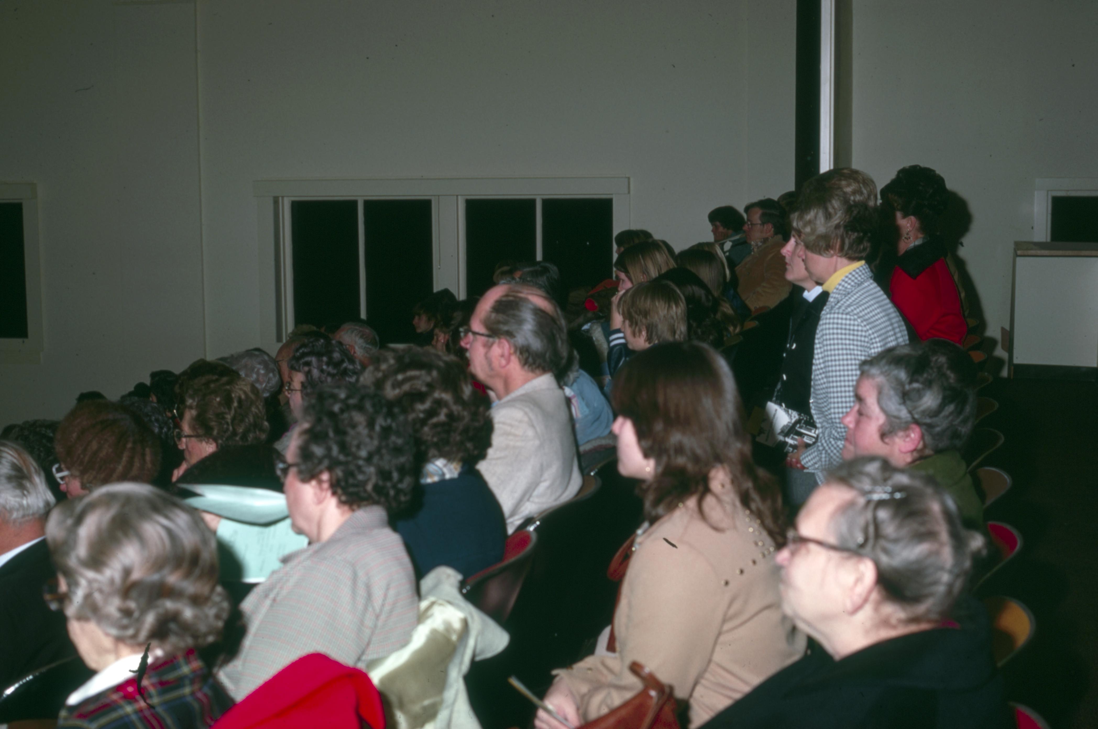 Murphy Auditorium: Murphy Auditorium is located at 419 Tavern Street and was constructed on the plat just east of the Working Men's Institute from 1911 to 1913, using the Doctor Edward Murphy Fund, and was built as part of New Harmony's centennial celebration of 1914. In 2014, the town's bicentennial, Murphy Auditorium became the new home of the concert series Under The Beams, originally housed in the Rapp-Owen Granary. Today, the auditorium is owned by the University of Southern Indiana and is the home of The New Harmony Theater with a seating capacity of 360 people. People are filling the seats in the finished auditorium.