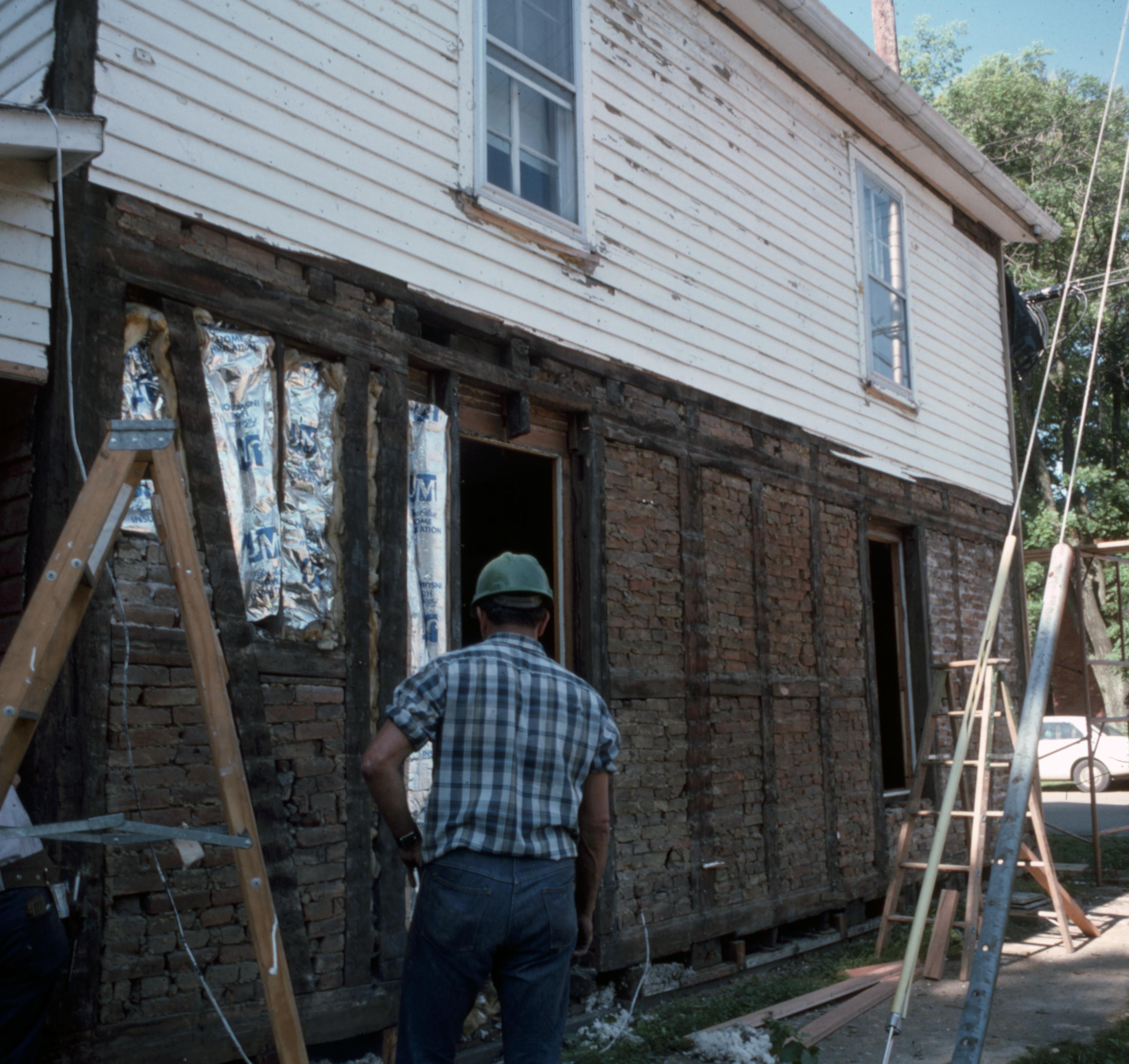 Autrieth House: This house is located at 605 Tavern Street and was constructed in 1855. This photo is of the north side of the home, facing Tavern Street, it shows where some of the in-fill bricks have been lost and were replaced with modern insulation. On the far left of the photo is the old carport, a 20 century addition to the house which was demolished during this restoration work.