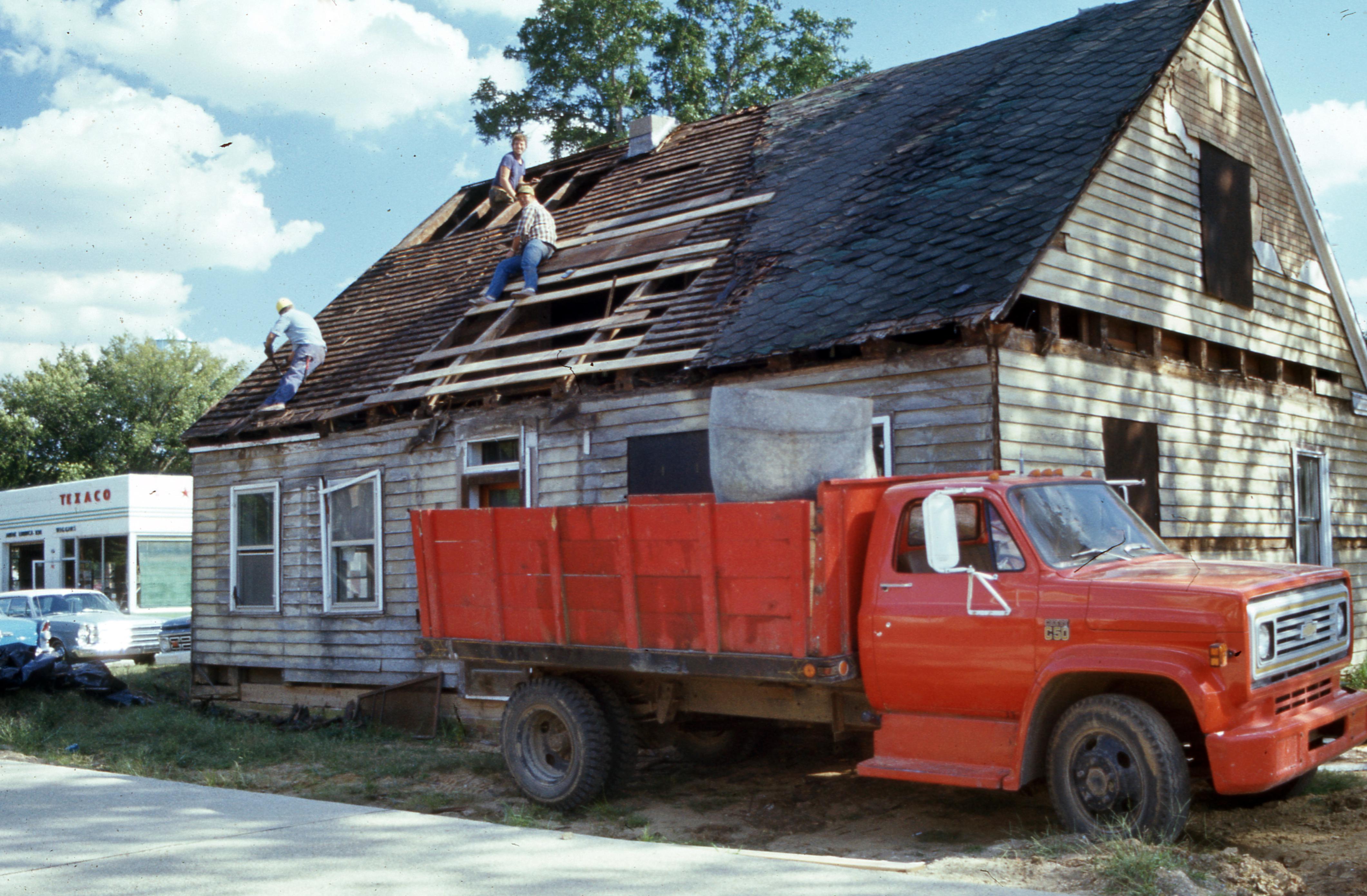 Beal House: The Beal House was moved during the Lanark Construction, on Town Block 8 E/W on Main Street to 611 Church Street. The Beal house was constructed around 1829 by John Beal, who was a carpenter in the Owen and Maclure community. Beal constructed the house from lumber and timbers from an older horse barn. The new location would be the site of the Beal House and 1850s Doctor's Office (The Doctor's Office was a remodel of the Kemmerling House, which was also moved to this site). Elmer Buchta Moving Engineers was contracted for this and many other building moves during the 1970s. This is a photo showing construction workers stripping off the old roofing. On the left side of the photo is the Texaco gas station, which is now a Marathon.