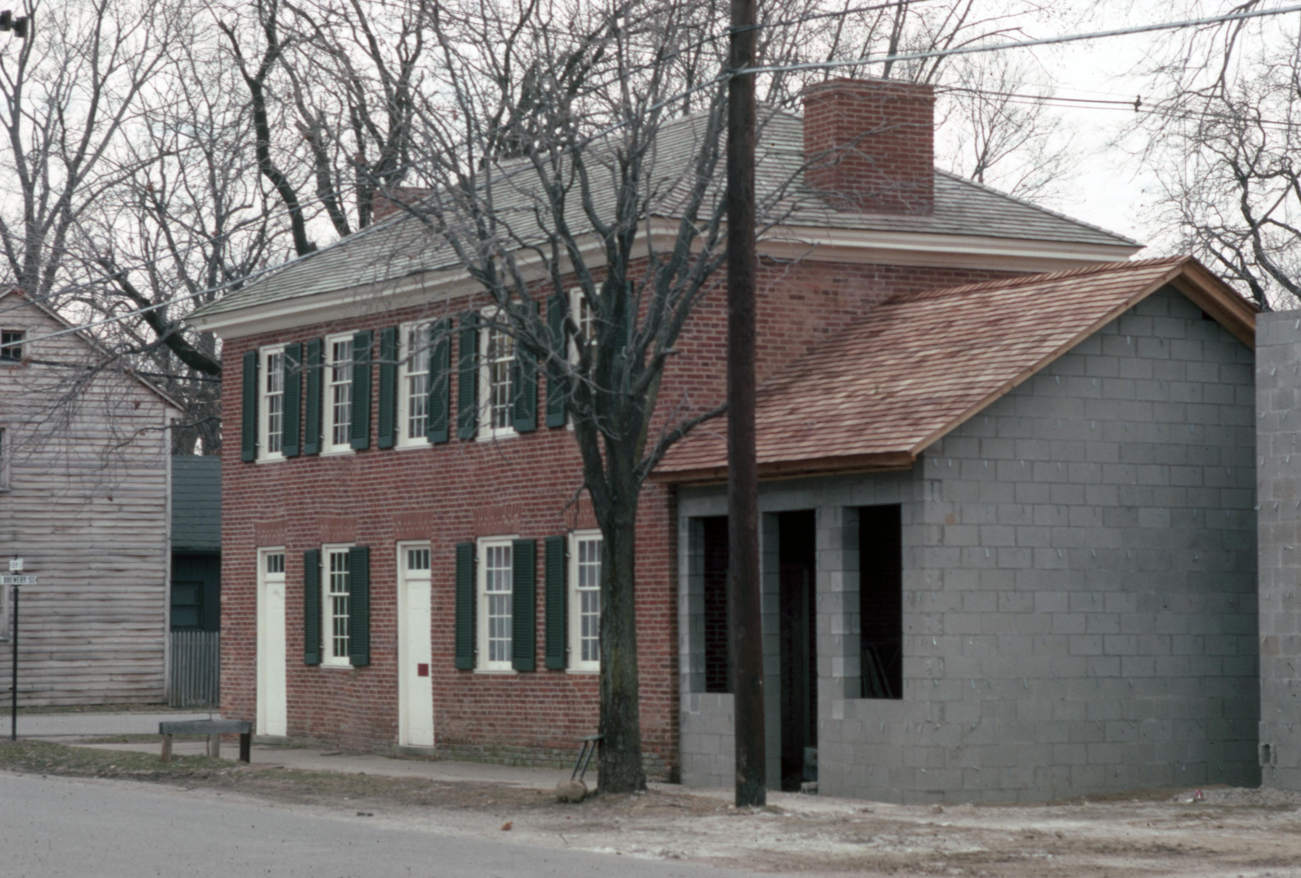 1830 Owen House: Located at 531 Tavern Street. This photo shows the 1830 Owen House west addition as it was under construction. The laundry building, New Harmony Speed Wash, just west of the Owen House, which can be seen on the far right of the photo, is also under construction.