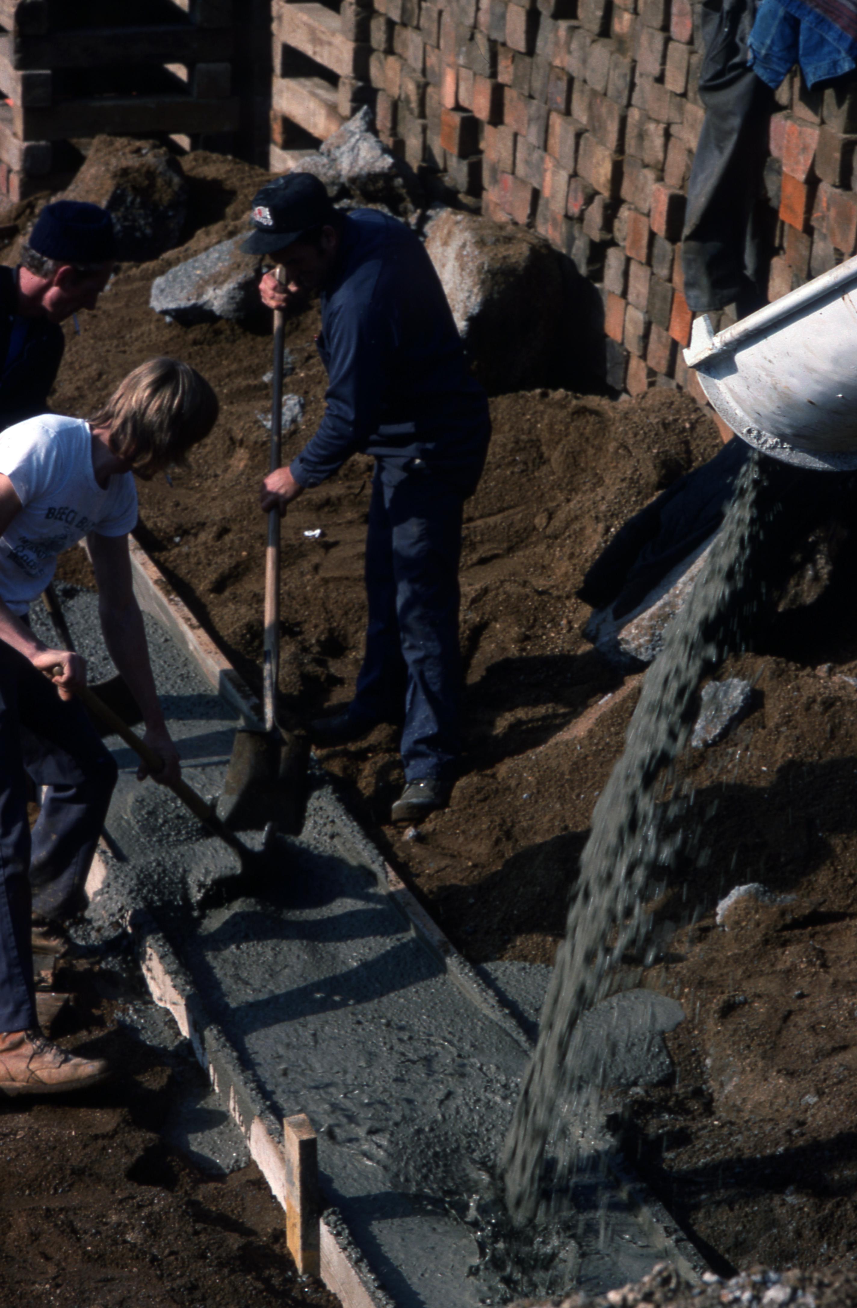 Beal House: The Beal House was moved during the Lanark Construction, on Town Block 8 E/W on Main Street to 611 Church Street. The Beal house was constructed around 1829 by John Beal, who was a carpenter in the Owen and Maclure community. Beal constructed the house from lumber and timbers from an older horse barn. The new location would be the site of the Beal House and 1850s Doctor's Office (The Doctor's Office was a remodel of the Kemmerling House, which was also moved to this site). Elmer Buchta Moving Engineers was contracted for this and many other building moves during the 1970s. This photo shows construction workers pouring the footer for the new foundation walls.