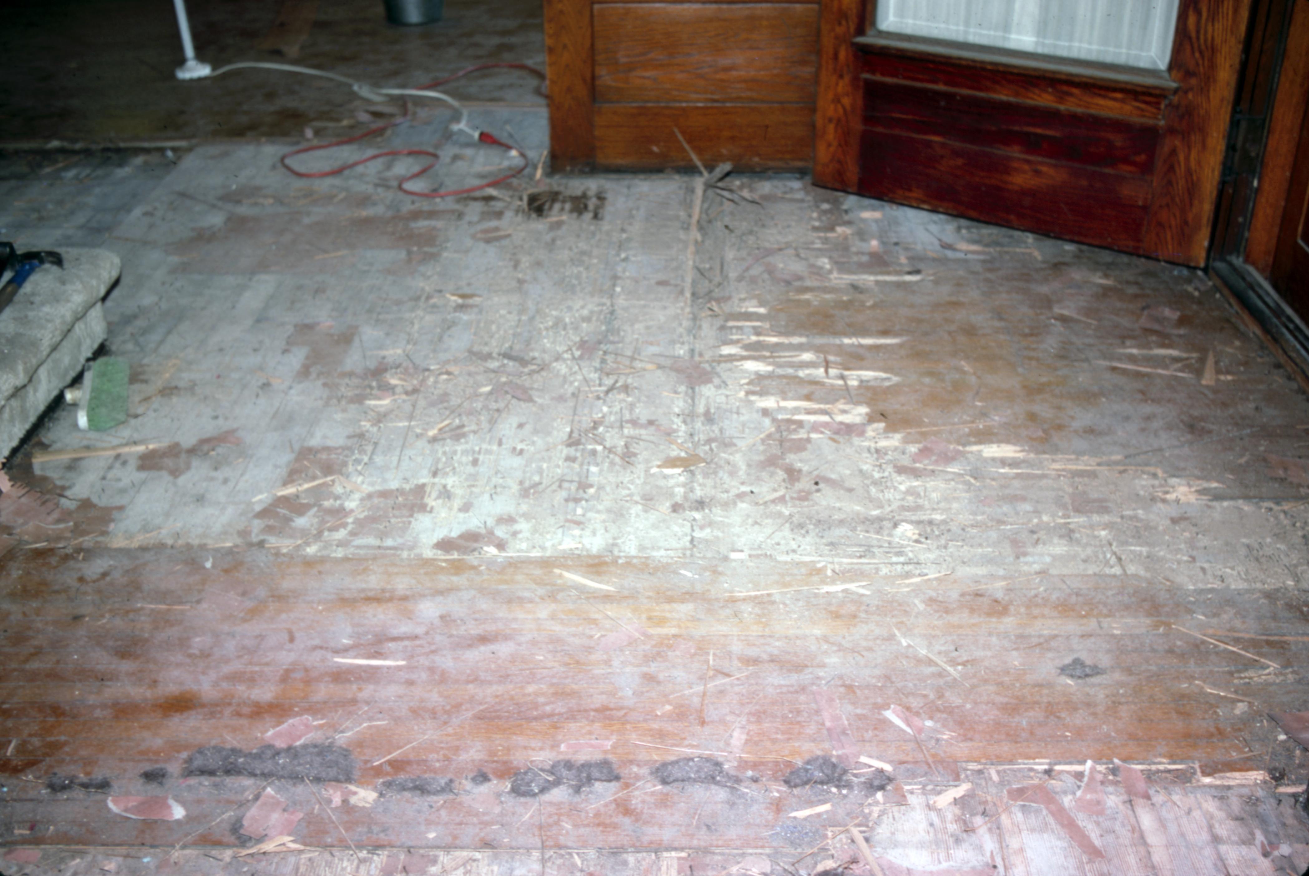 Schnee House: This photo is of the second Schnee home located at 603 West Street and was constructed in 1876. The first Schnee home was constructed during the Rappite occupation of the town, the Schnee brothers having moved to the town from the Quaker colony in Pennsylvania, and that house was located at 517 Tavern Street. The Gypsy Girl Livery Stable was later constructed behind that home. In this photo the later period hardwood flooring is being taken up. There may be remnants of a linoleum floor under the hardwood which is being removed. This debris can be seen at the bottom of the photo on the left and right sides.