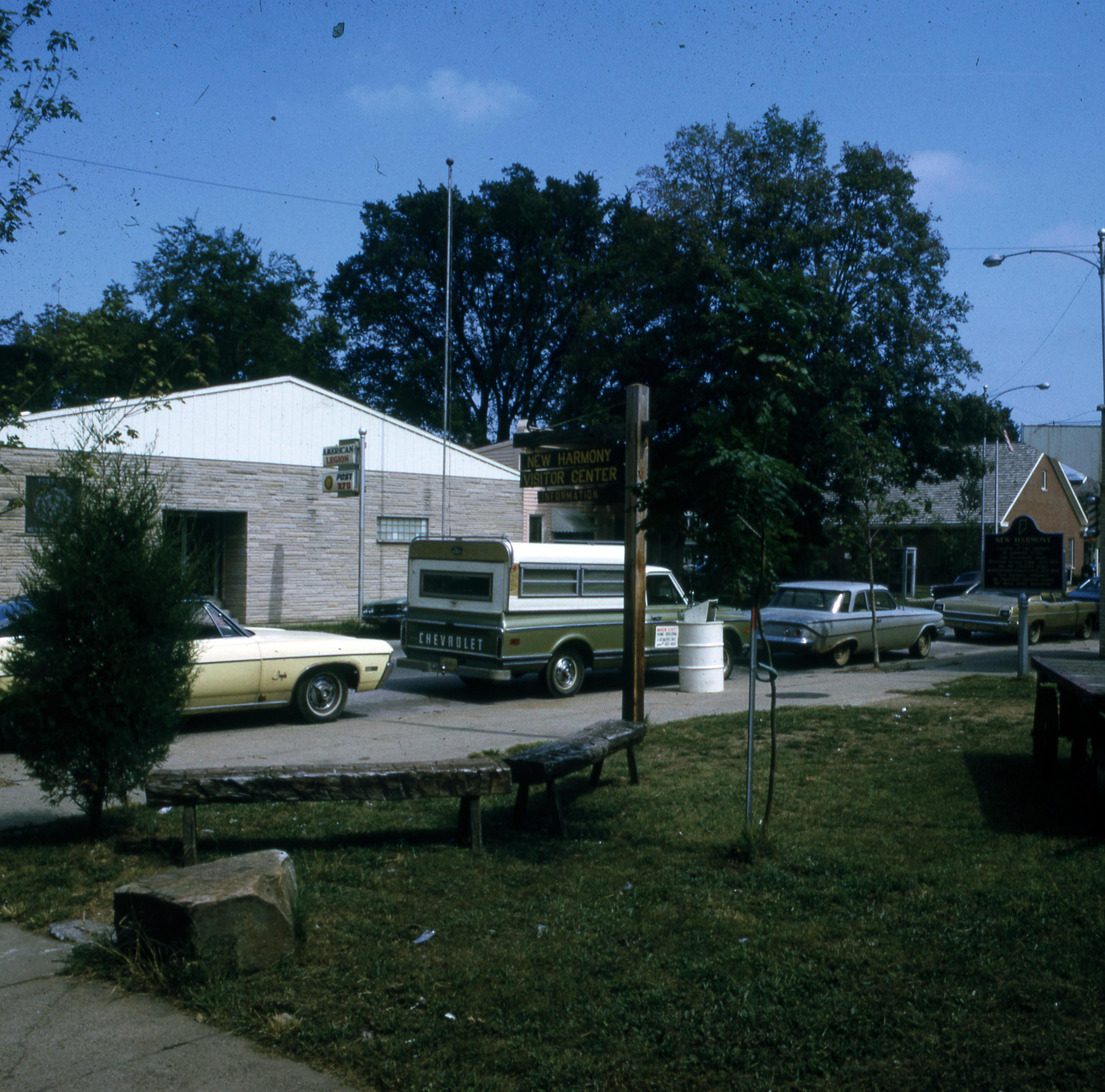 Back plats: This is a photo of Town Block 5 E facing north toward Church Street. The Old New Harmony Train Depot, which was being used as the New Harmony Visitor's Center, had been moved to this plat from Third Street and was again moved to 801 North Street. This plat was also the site of the Old Community House Dorm #3, which was converted to a hotel after Owen and Maclure purchased the town in 1824. This building was still listed on the 1943 updated Sanborn Fire Insurance Map, although it was listed as being vacant. The American Legion Post #370 can be seen across Church Street.