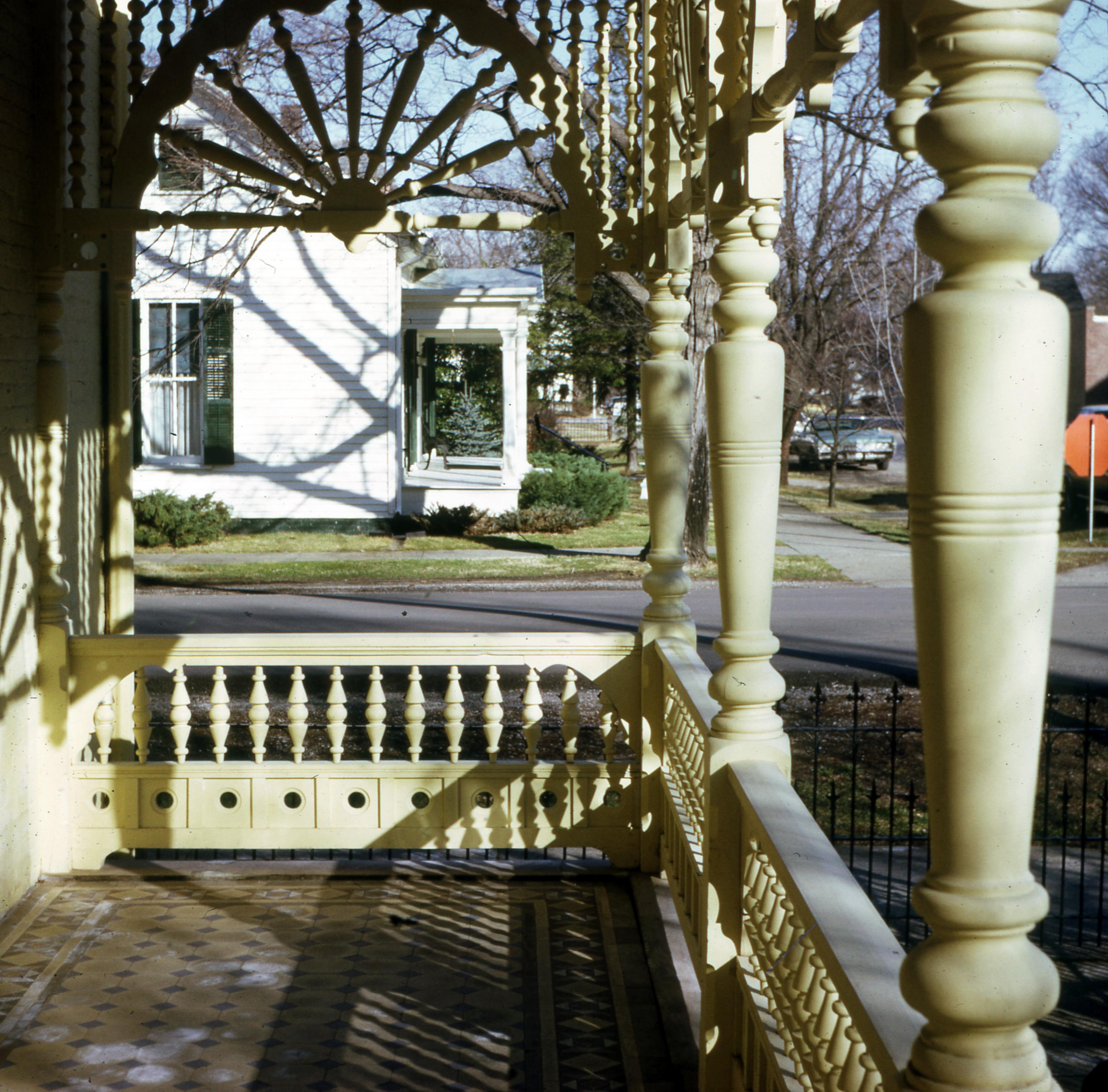Schnee House: This photo is of the second Schnee home located at 603 West Street and was constructed in 1876. The first Schnee home was constructed during the Rappite occupation of the town, the Schnee brothers having moved to the town from the Quaker colony in Pennsylvania, and that house was located at 517 Tavern Street. The Gypsy Girl Livery Stable was later constructed behind that home. This photo shows the front porch, on the east wall of the home, from on the porch itself. The color mosaic tile floor is clearly visible in this photo.