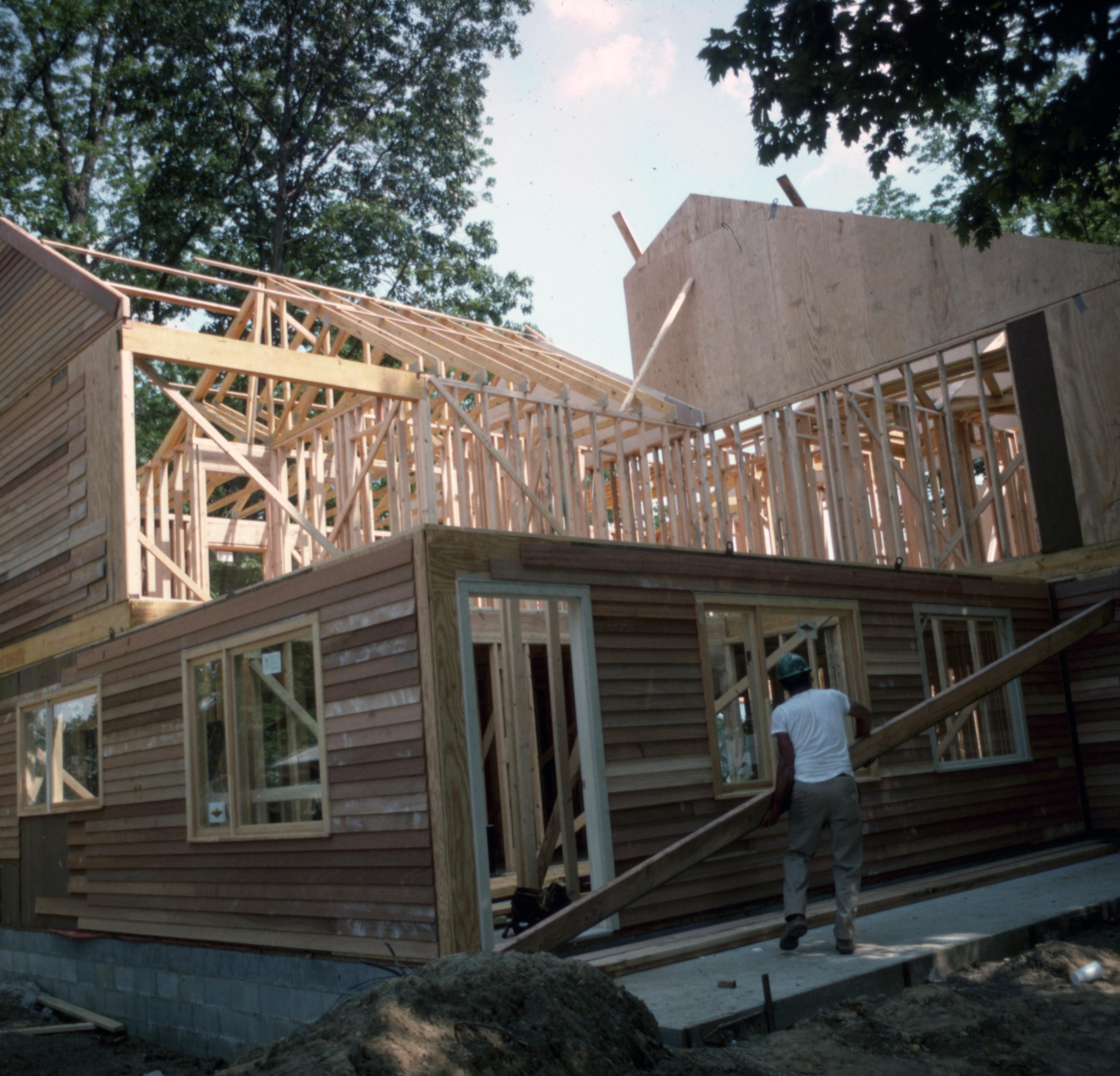 Lanark Development Collection: Construction of 820 Main Street New Harmony Indiana. Men working on the construction of the second story.