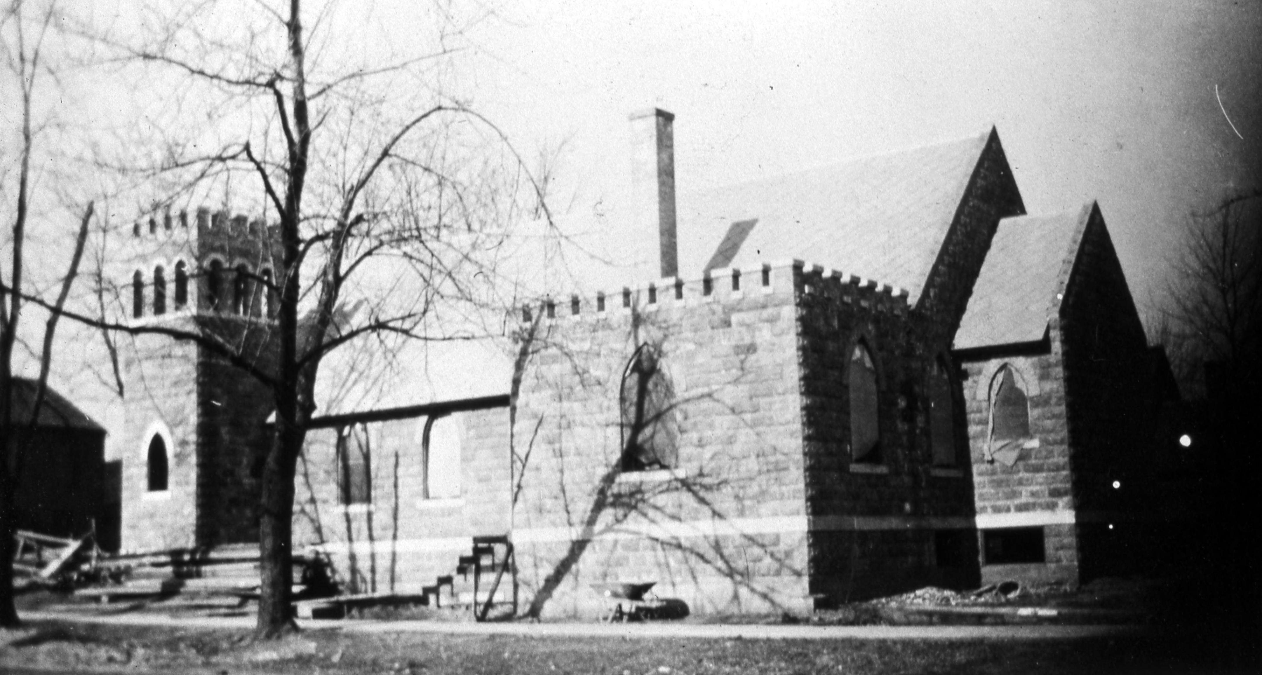 St. Stephen's Church: The church was first organized in 1841 and in 1843 the west wing of the old Rappite church was given for use by the Episcopal�s by Alexander and Anne Maclure. At this time the old burial ground was also given to the church, which was bought back by the Rappites in 1846. Then in 1850 the Episcopal�s sold the west wing of the old Rappite Church for $1000 and in 1854 St. Stephen�s Church was constructed, the North Street location where the Lenz House now resides.1888 saw the construction of a new belfry add to the church to accommodate the new bell. In 1911 the new church was built, and an addition was made to it in 1927. The church is still present as of 2022. This photo shows the present church as it was under construction.