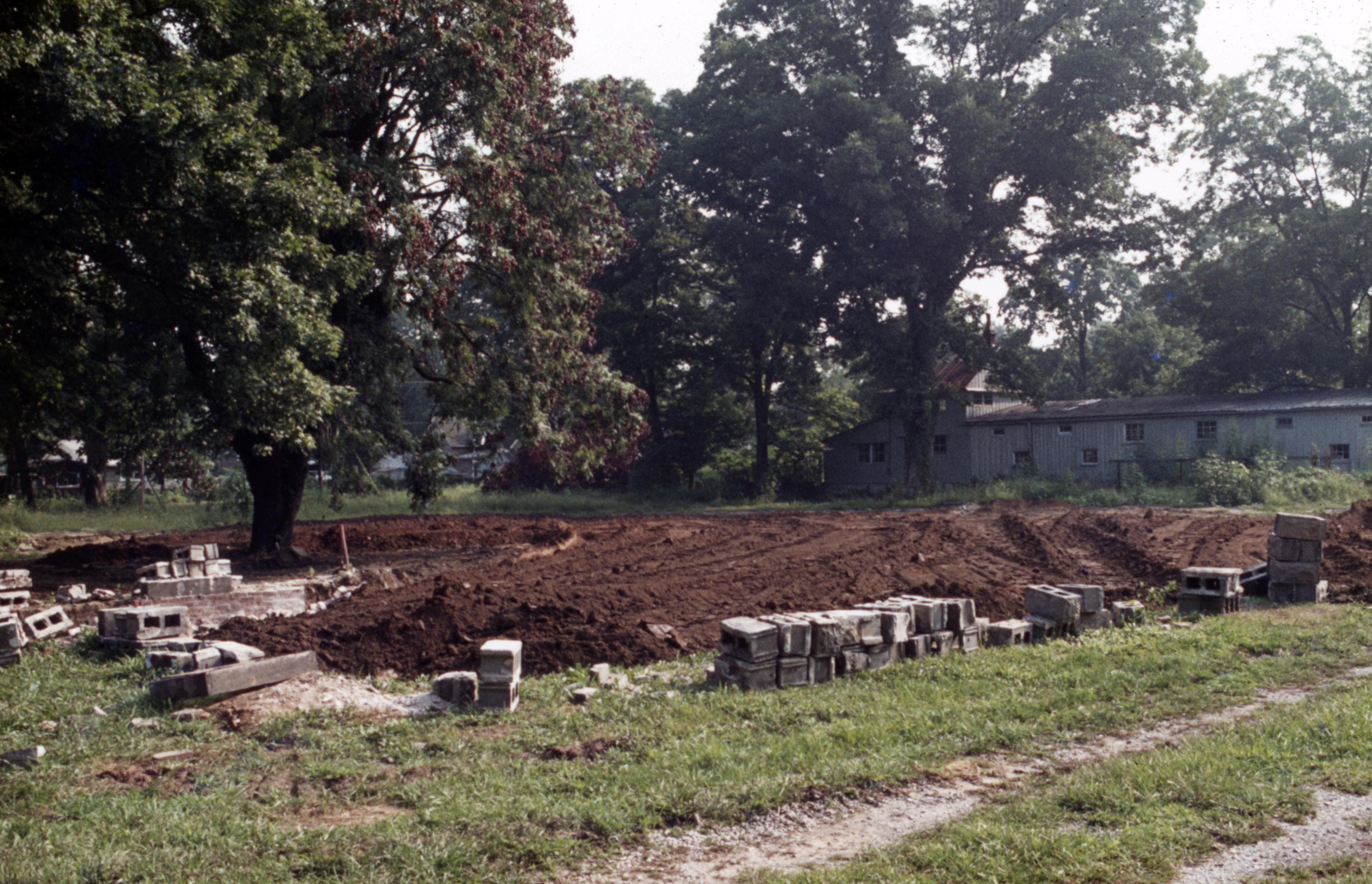 Lanark Development Collection: Construction of 820 Main Street New Harmony Indiana. This photo shows where the small building had been moved from afterward. The long metal building in the background was demolished.
