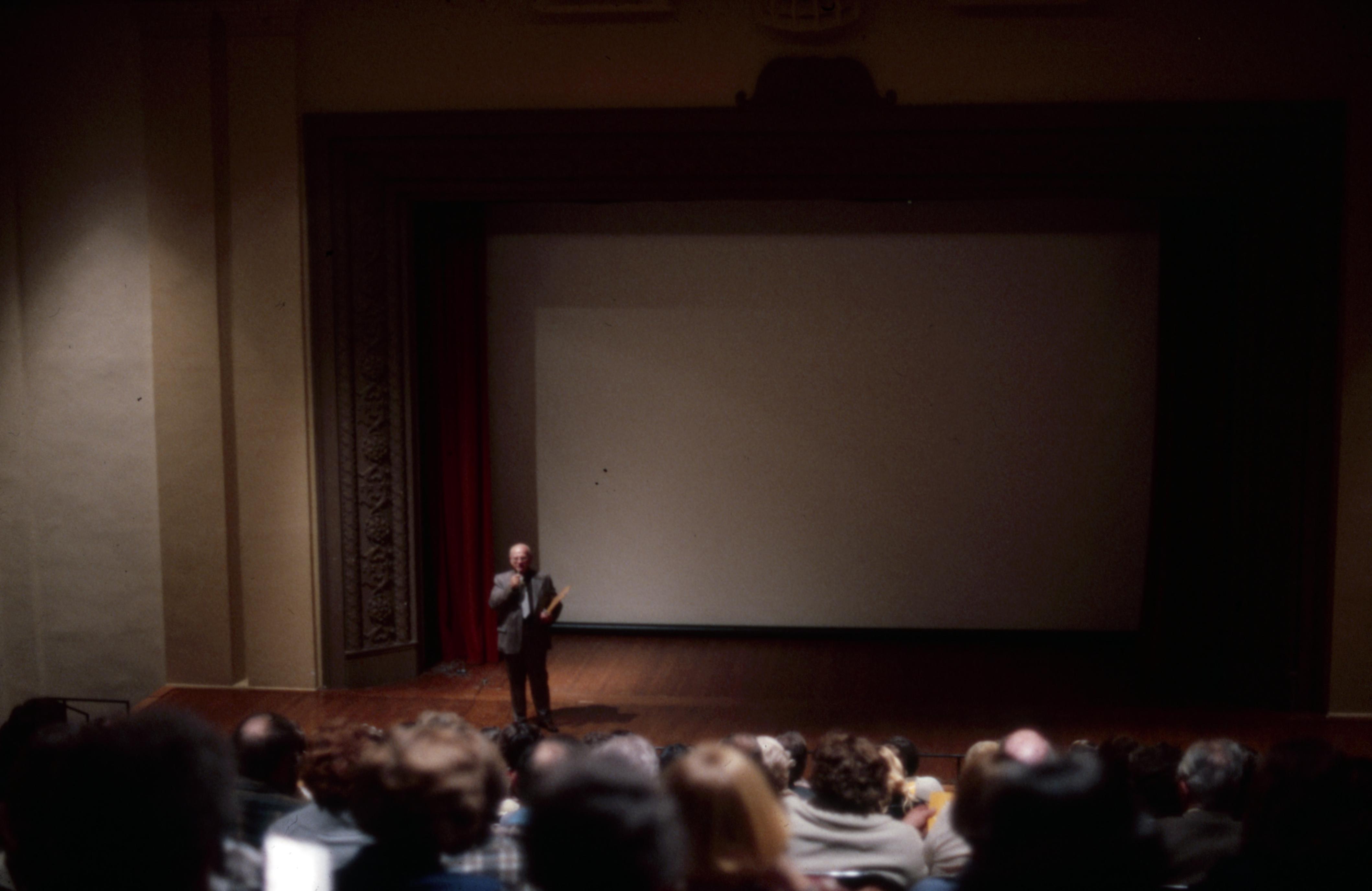 Murphy Auditorium: Murphy Auditorium is located at 419 Tavern Street and was constructed on the plat just east of the Working Men's Institute from 1911 to 1913, using the Doctor Edward Murphy Fund, and was built as part of New Harmony's centennial celebration of 1914. In 2014, the town's bicentennial, Murphy Auditorium became the new home of the concert series Under The Beams, originally housed in the Rapp-Owen Granary. Today, the auditorium is owned by the University of Southern Indiana and is the home of The New Harmony Theater with a seating capacity of 360 people. In this photo a man is giving a speech before giving an award to another man.