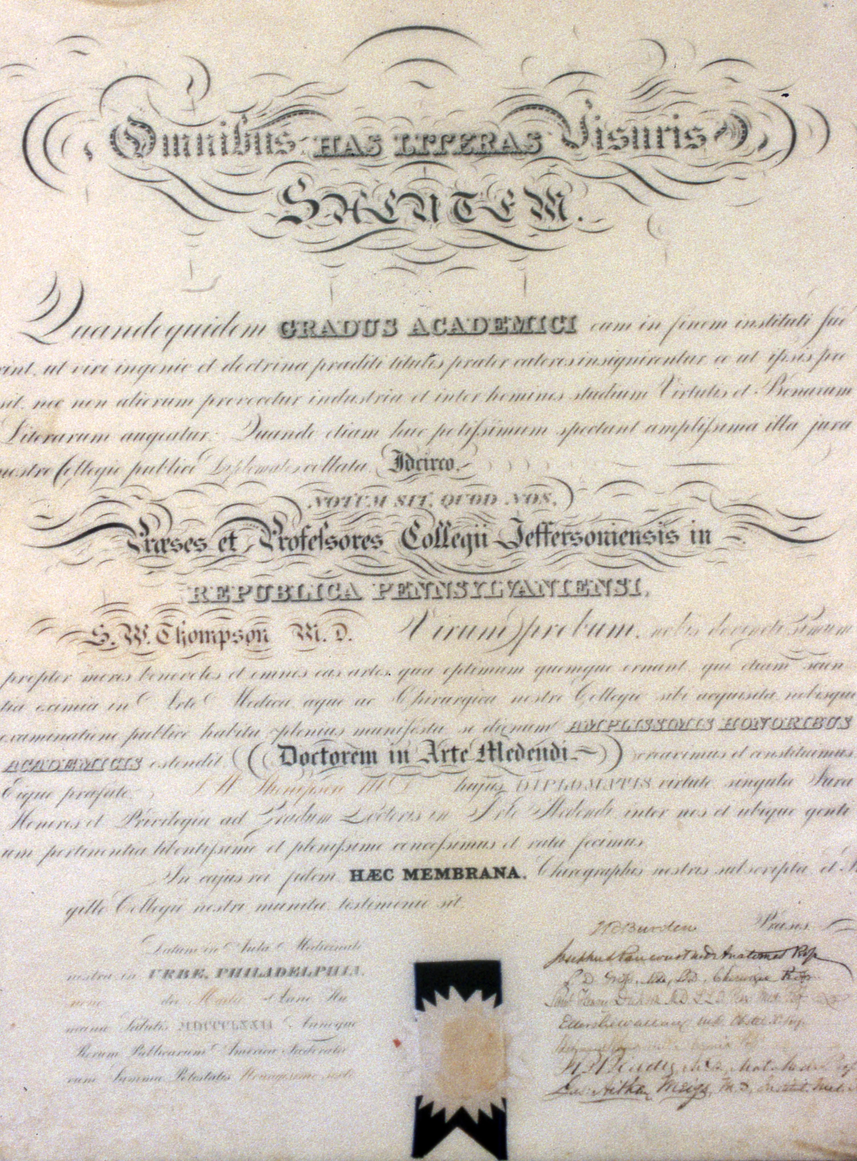 Kemmerling House/1850s Doctor's Office: The Kemmerling House was relocated from town Block 4 J/SE to the new location at 611 Church Street, beside the Beal House. The Kemmerling House was remodeled into the 1850s Doctor's Office, a gift to the town of New Harmony from Mead Johnson. The Kemmerlings were listed in the 1882 Posey County Directory (as Kimmerlin) as being New Harmony Township farmers. Elmer Buchta Moving Engineers was contracted for this and many other building moves during the 1970s. This photo shows the certificate of a degree in Doctor of Arts in Medicine. Part of the gift of the 1850s Doctor's Office from Mead Johnson.