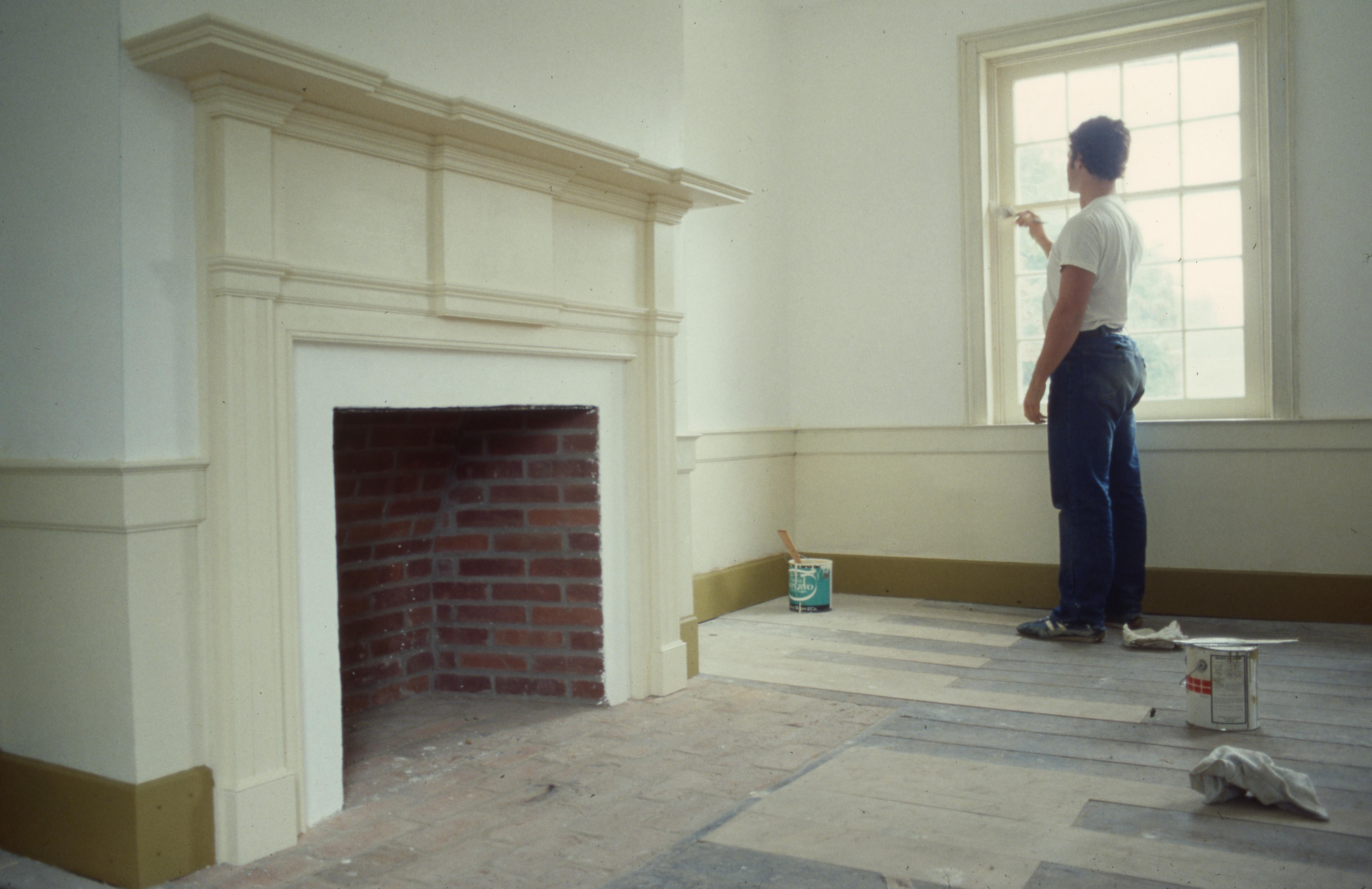 1830 Owen House: Located at 531 Tavern Street. A construction worker painting the window casing of the 1830 Owen House.