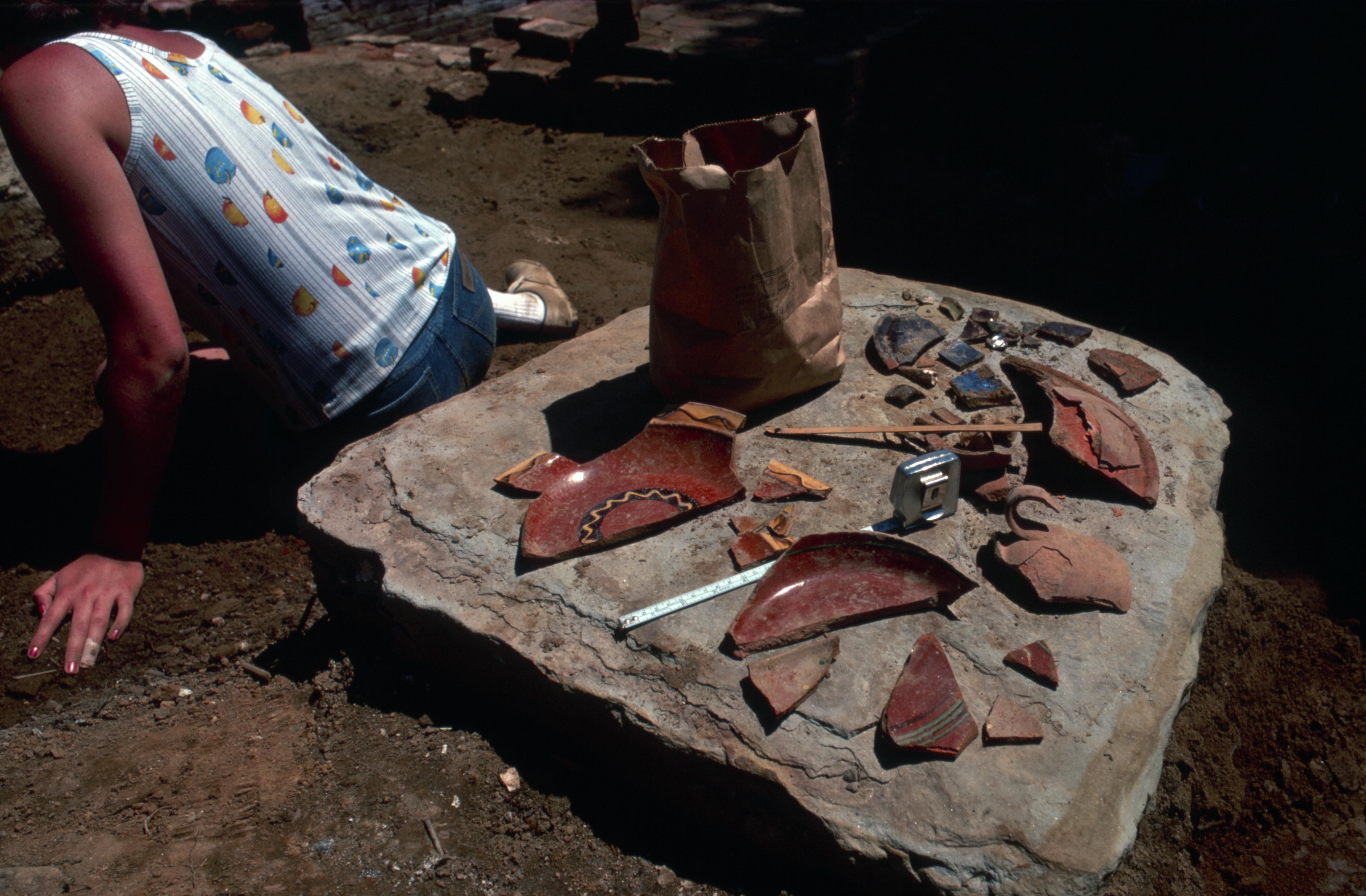 Indiana State University Evansville Archaeological Dig Collection: Russell(Kepler) House. This location was on the bend where Arthur Street merges with North Street. These buildings were moved or demolished to construct the Historic New Harmony Atheneum and parking plat. A group of people working on the dig site. A collection of pottery sherds can be seen on a concrete slab.
