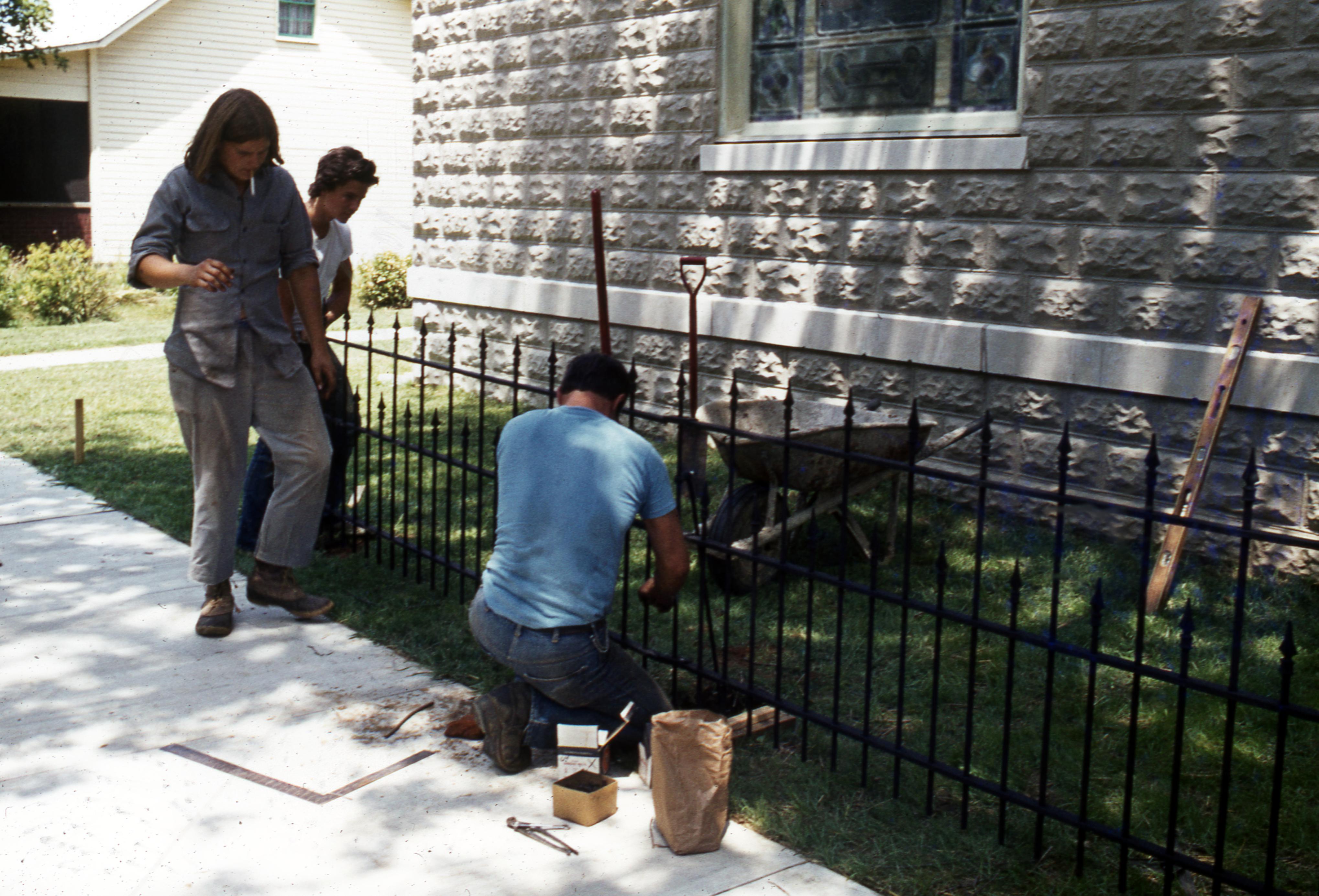 St. Stephen's Episcopal Church: The church was first organized in 1841 and in 1843 the west wing of the old Rappite church was given for use by the Episcopal�s by Alexander and Anne Maclure. At this time the old burial ground was also given to the church, which was bought back by the Rappites in 1846. Then in 1850 the Episcopal�s sold the west wing of the old Rappite Church for $1000 and in 1854 St. Stephen�s Church was constructed, the North Street location where the Lenz House now resides.1888 saw the construction of a new belfry add to the church to accommodate the new bell. In 1911 the new church was built, and an addition was made to it in 1927. The church is still present as of 2022. This photo shows the iron fence being installed.