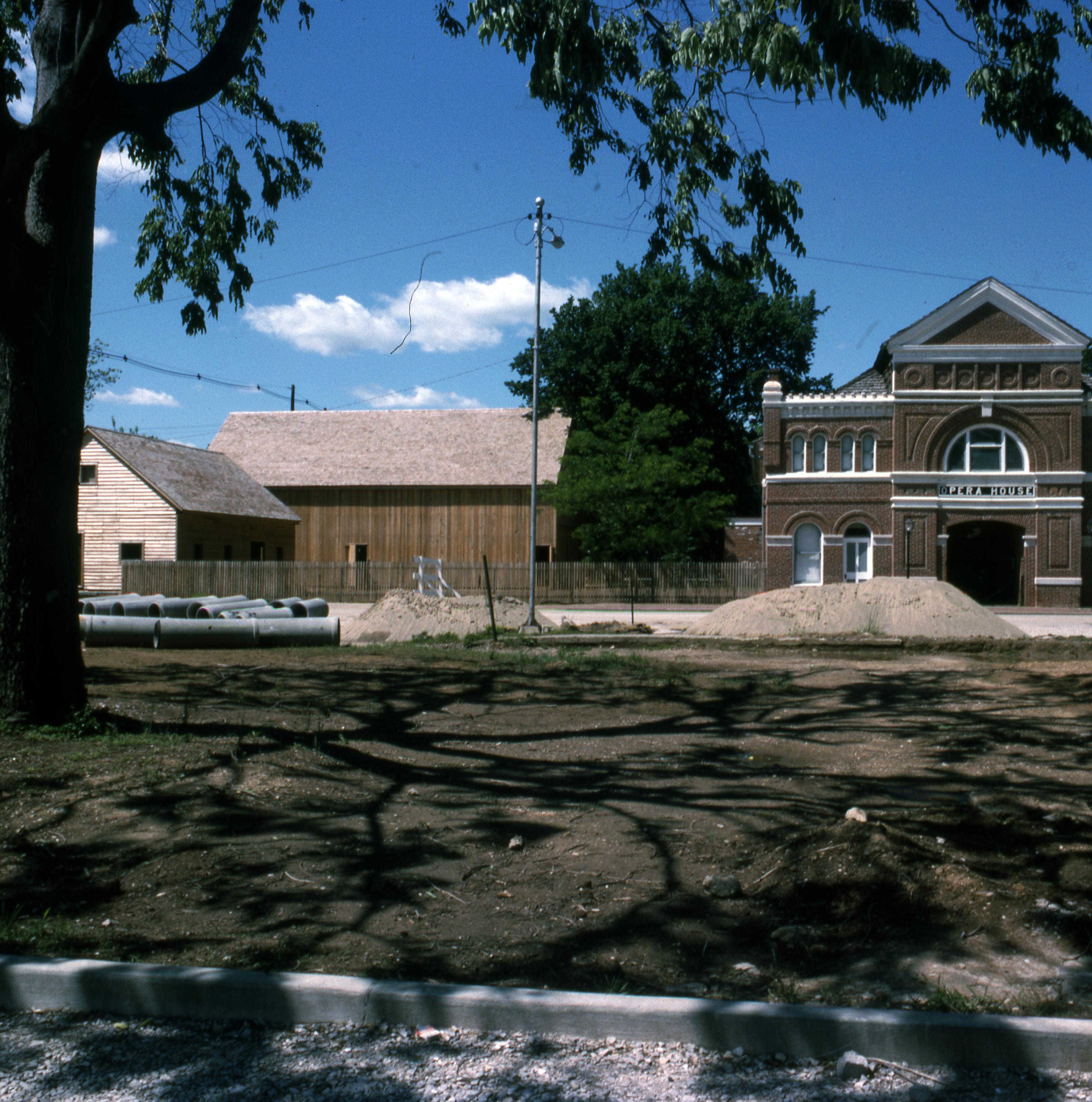 Beal House: The Beal House was moved during the Lanark Construction, on Town Block 8 E/W on Main Street to 611 Church Street. The Beal house was constructed around 1829 by John Beal, who was a carpenter in the Owen and Maclure community. Beal constructed the house from lumber and timbers from an older horse barn. The new location would be the site of the Beal House and 1850s Doctor's Office (The Doctor's Office was a remodel of the Kemmerling House, which was also moved to this site). Elmer Buchta Moving Engineers was contracted for this and many other building moves during the 1970s. In this photo, across Church Street, is Thrall's Opera House. To the left of it is the newly constructed Theater Barn and remodeled Cooper House.