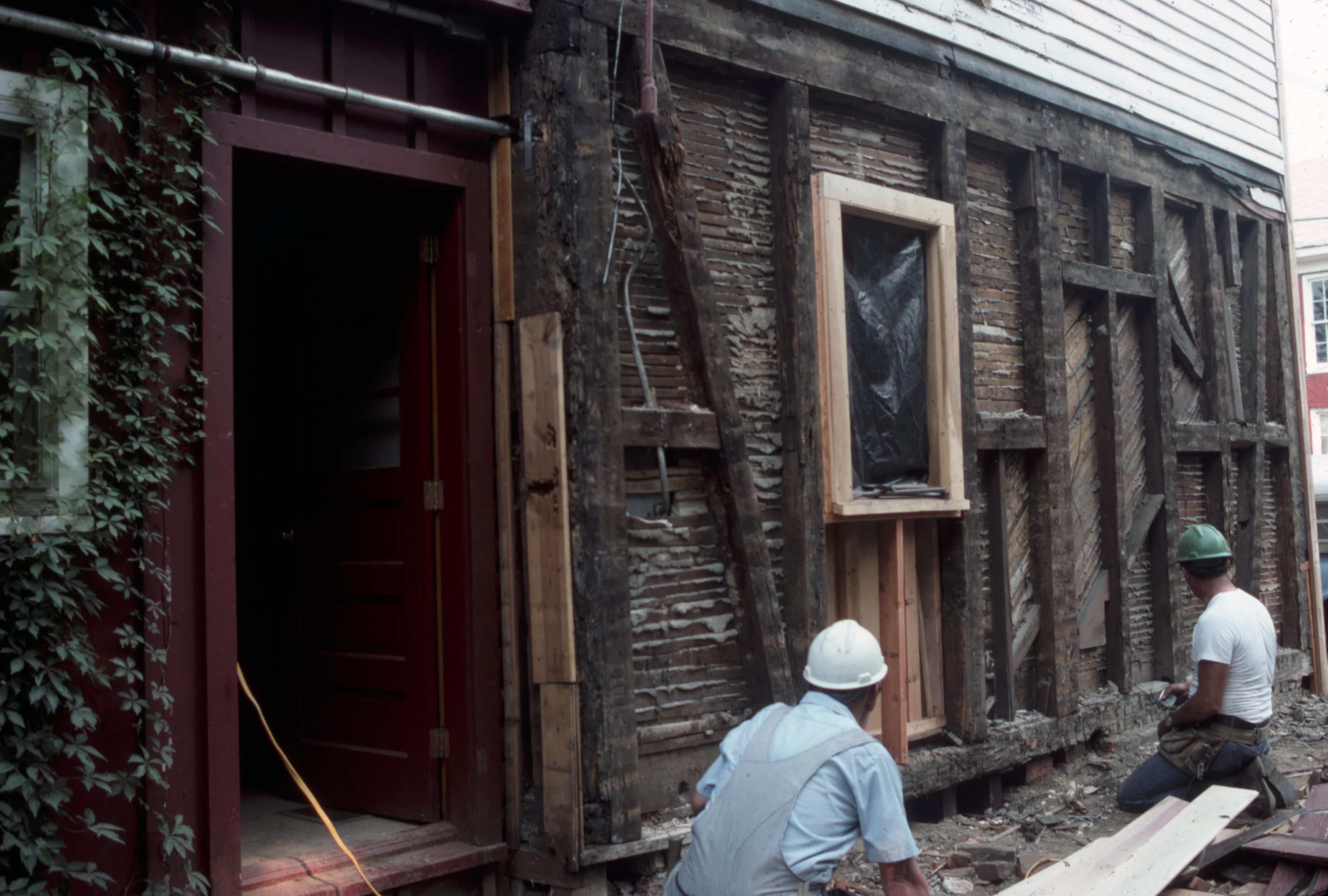Autrieth House: This house is located at 605 Tavern Street and was constructed in 1855. This is the east side of the house after the twentieth century carport was removed and the old timber frame exposed. The brick in-fill is missing from this side, most likely removed when the carport and porch were added at a later time.