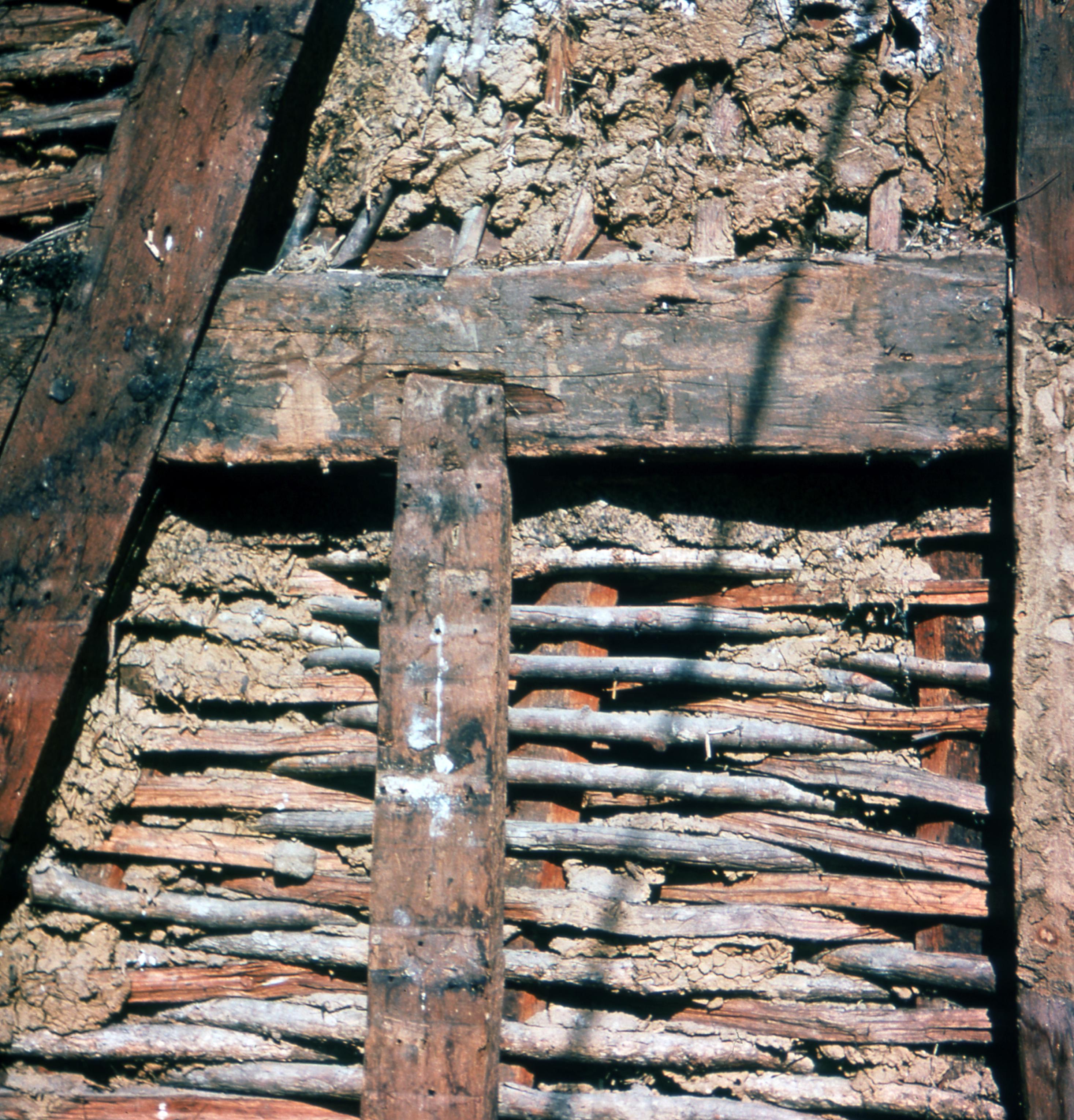 Beal House: The Beal House was moved during the Lanark Construction, on Town Block 8 E/W on Main Street to 611 Church Street. The Beal house was constructed around 1829 by John Beal, who was a carpenter in the Owen and Maclure community. Beal constructed the house from lumber and timbers from an older horse barn. The new location would be the site of the Beal House and 1850s Doctor's Office (The Doctor's Office was a remodel of the Kemmerling House, which was also moved to this site). Elmer Buchta Moving Engineers was contracted for this and many other building moves during the 1970s. This photo shows the house as the old clapboards were being removed. Note the wattle and daub infill.