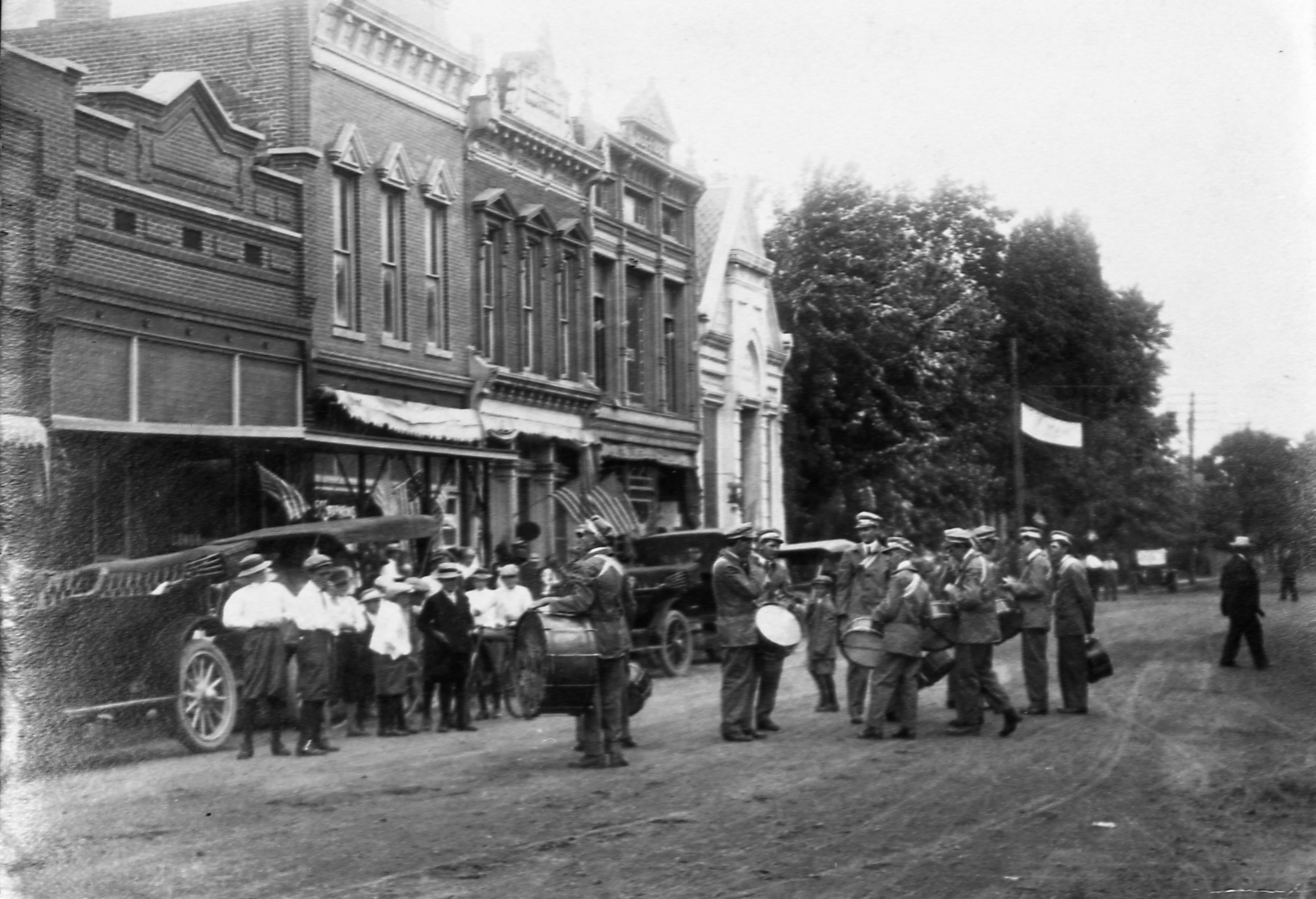 Transparencies and Negatives Collection: Historic photographs. This is a photo of a marching band gathered on Main Street between Church and Tavern Streets.