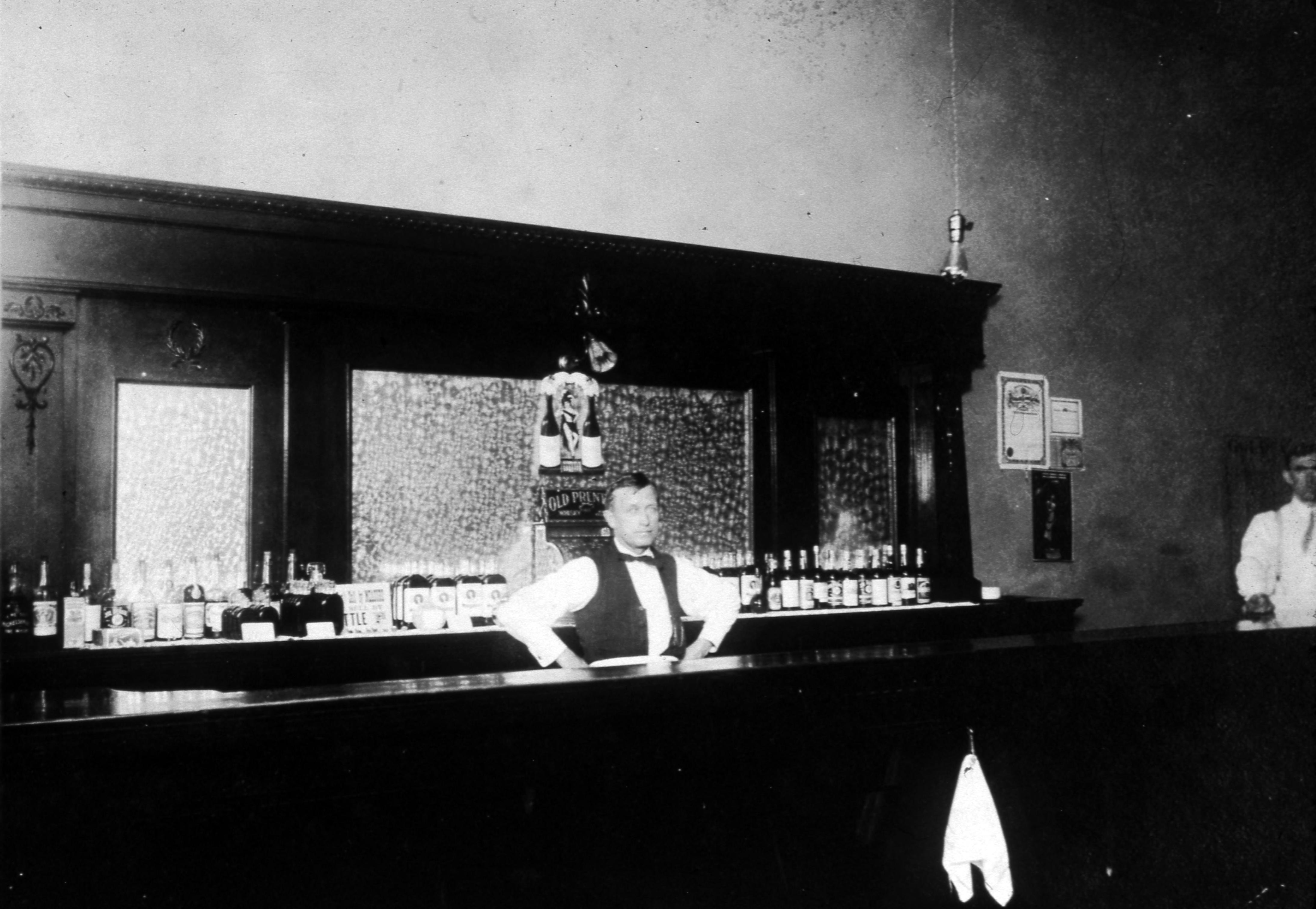 Chaffin's Saloon: Charlie Chaffin was born a New Harmony resident in 1881 to John ""Horacio"" and Edith Applegate Chaffin. At the age of 19 he was already listed as a bartender, probably at his father's saloon, on the 1900 United States Census, by the 1910 Census, at the age of 29 he was listed as the proprietor of the saloon. This historic photo was probably taken within his saloon, most likely located at what is now 516 Main Street. The photo shows Charles on the far right side of the photo. The man behind the bar is possibly his cousin Edwin Chaffin Ford.