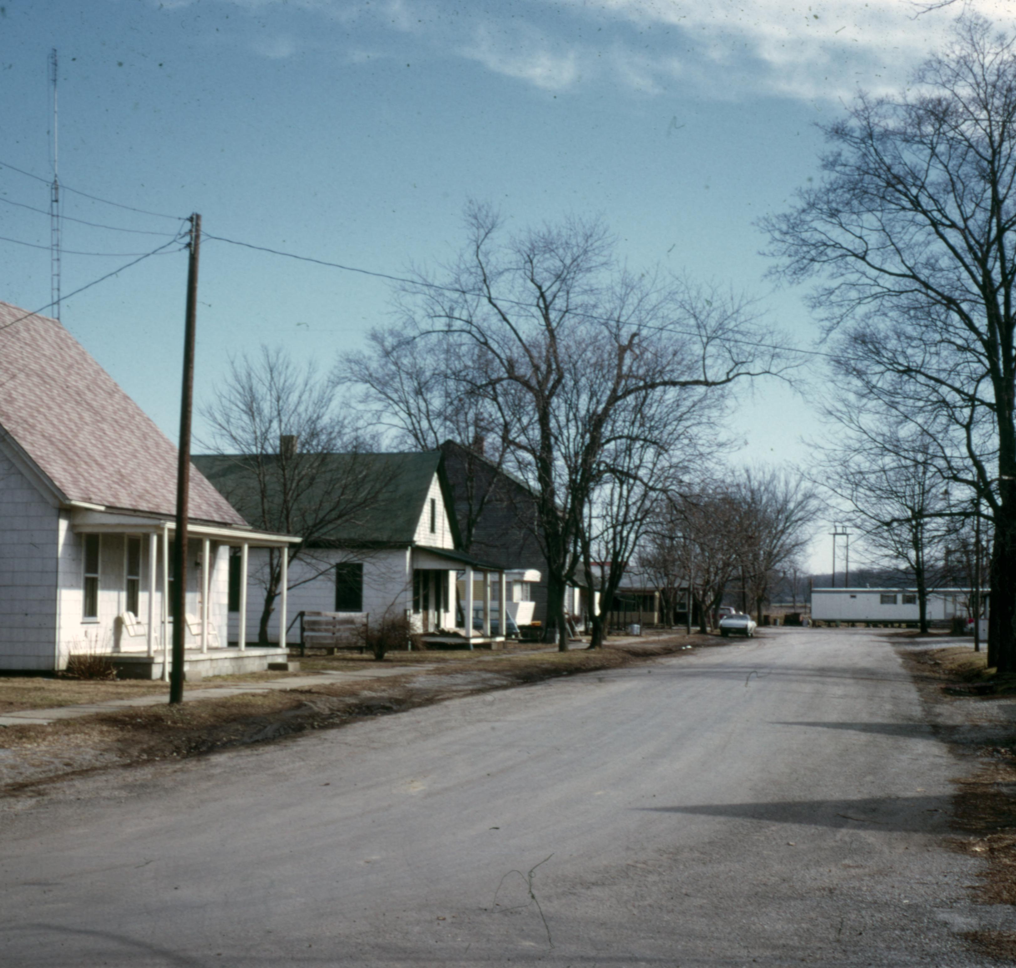 Fredrick Street Constructions Collection: Row of houses on the north side of Fredrick Street. The House on the left side of the photo is still present as of 2020. The small white building to the right of the first was moved. The building to the right of the mobile home is an original structure from the Owen era. There is another small white house to the right of the Owen structure which is also still present as of 2020.