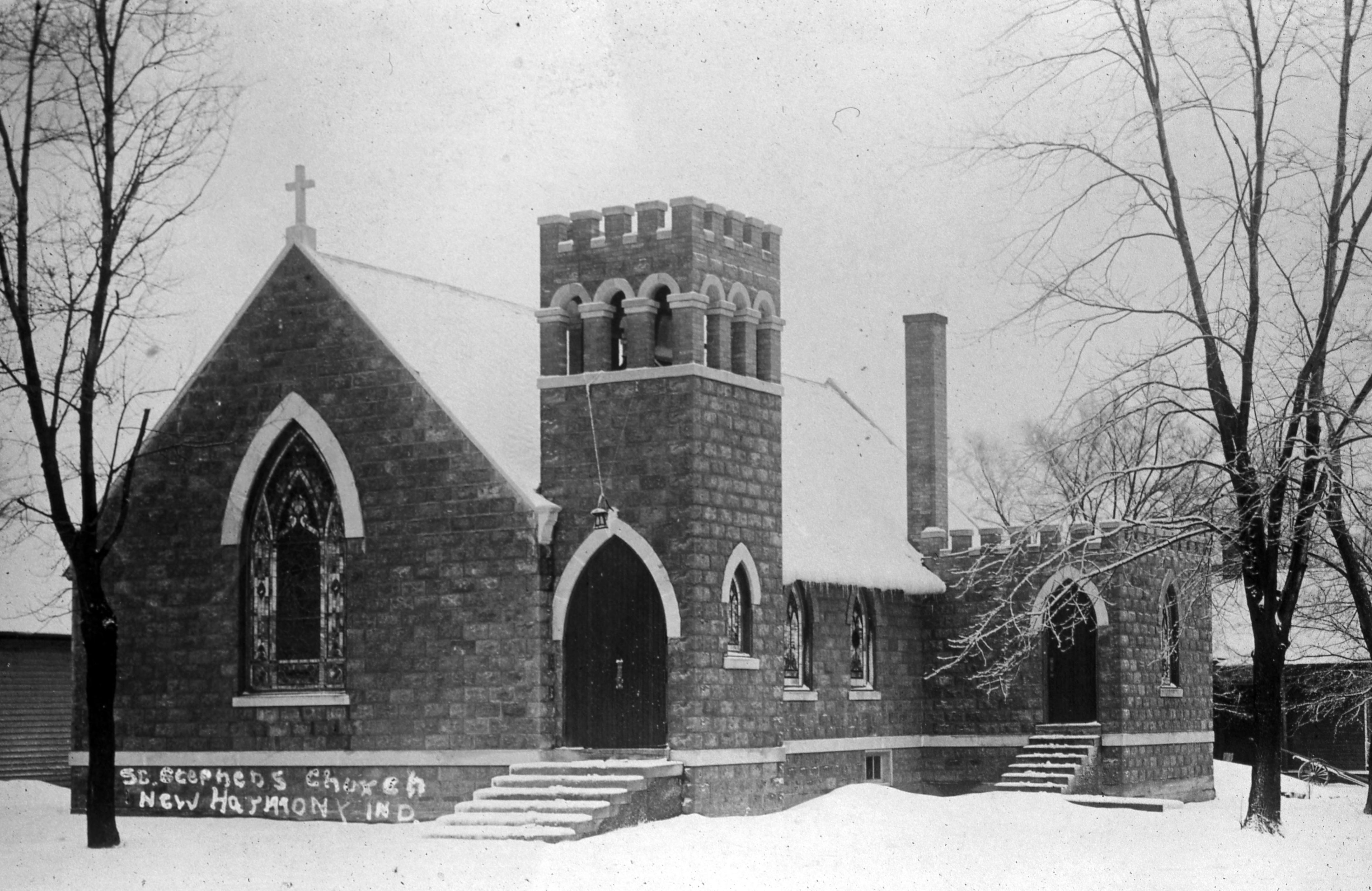 St. Stephen's Church: The church was first organized in 1841 and in 1843 the west wing of the old Rappite church was given for use by the Episcopal�s by Alexander and Anne Maclure. At this time the old burial ground was also given to the church, which was bought back by the Rappites in 1846. Then in 1850 the Episcopal�s sold the west wing of the old Rappite Church for $1000 and in 1854 St. Stephen�s Church was constructed, the North Street location where the Lenz House now resides.1888 saw the construction of a new belfry add to the church to accommodate the new bell. In 1911 the new church was built, and an addition was made to it in 1927. The church is still present as of 2022. This shows the church after a snow event.