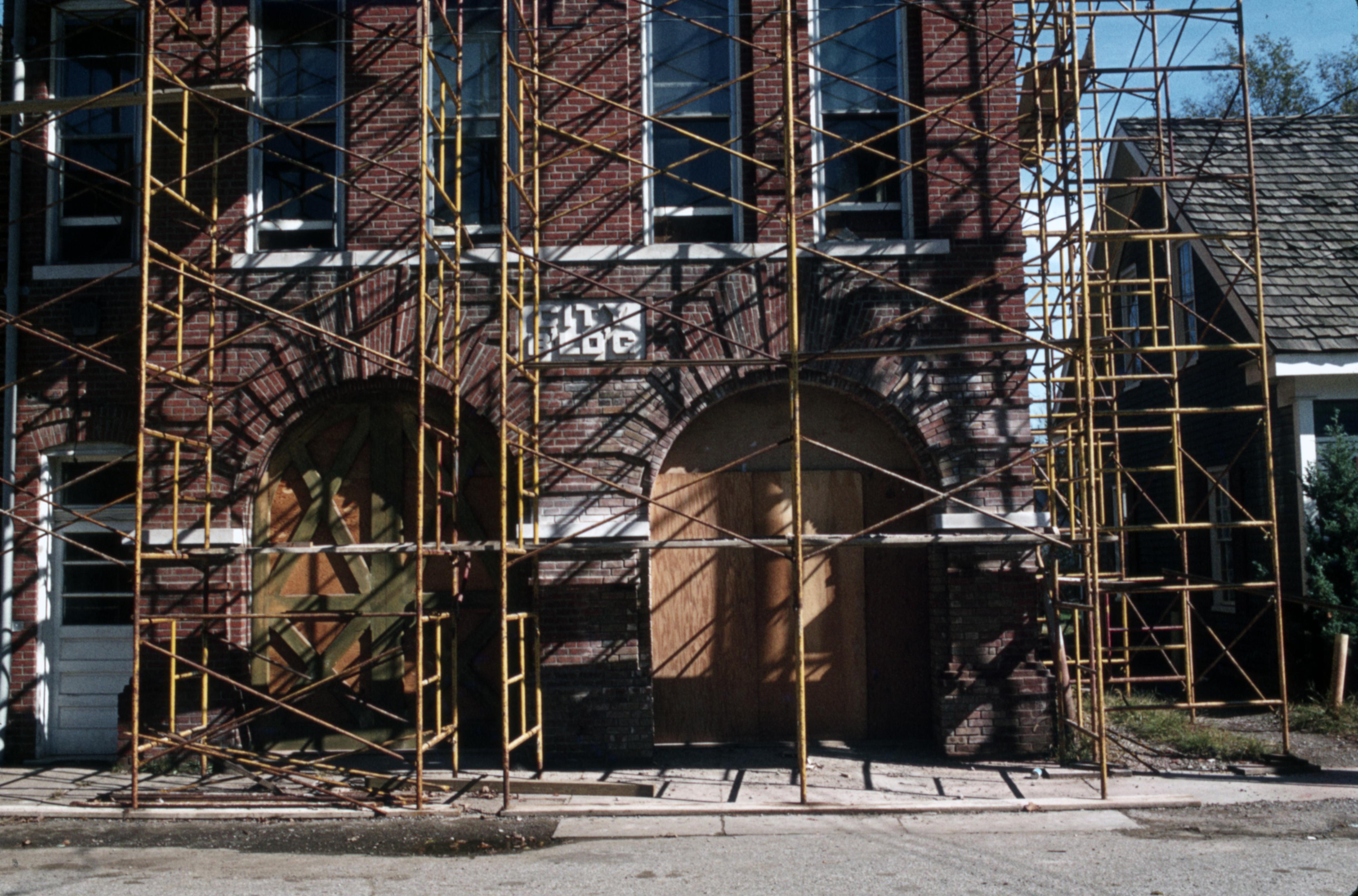 The City Building: This building is Located at 608 Main Street and housed the firehouse on the ground floor and City Hall on the second floor. The photo shows the continuation of the rebuilding of the brickwork on the right side of the building.