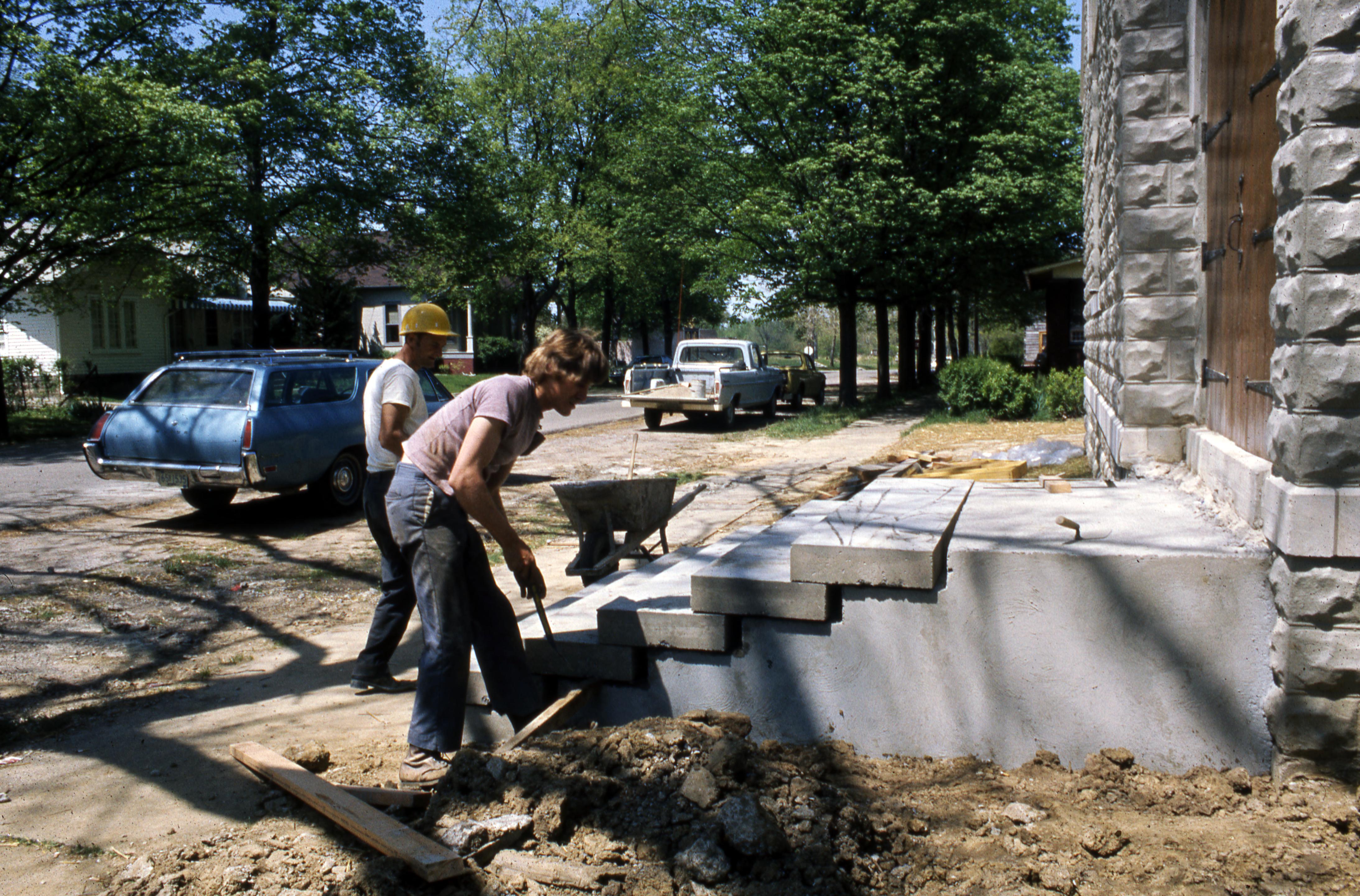 St. Stephen's Episcopal Church: The church was first organized in 1841 and in 1843 the west wing of the old Rappite church was given for use by the Episcopal�s by Alexander and Anne Maclure. At this time the old burial ground was also given to the church, which was bought back by the Rappites in 1846. Then in 1850 the Episcopal�s sold the west wing of the old Rappite Church for $1000 and in 1854 St. Stephen�s Church was constructed, the North Street location where the Lenz House now resides.1888 saw the construction of a new belfry add to the church to accommodate the new bell. In 1911 the new church was built, and an addition was made to it in 1927. The church is still present as of 2022. This is a photo of construction workers reconstructing the front steps of the church during renovations.