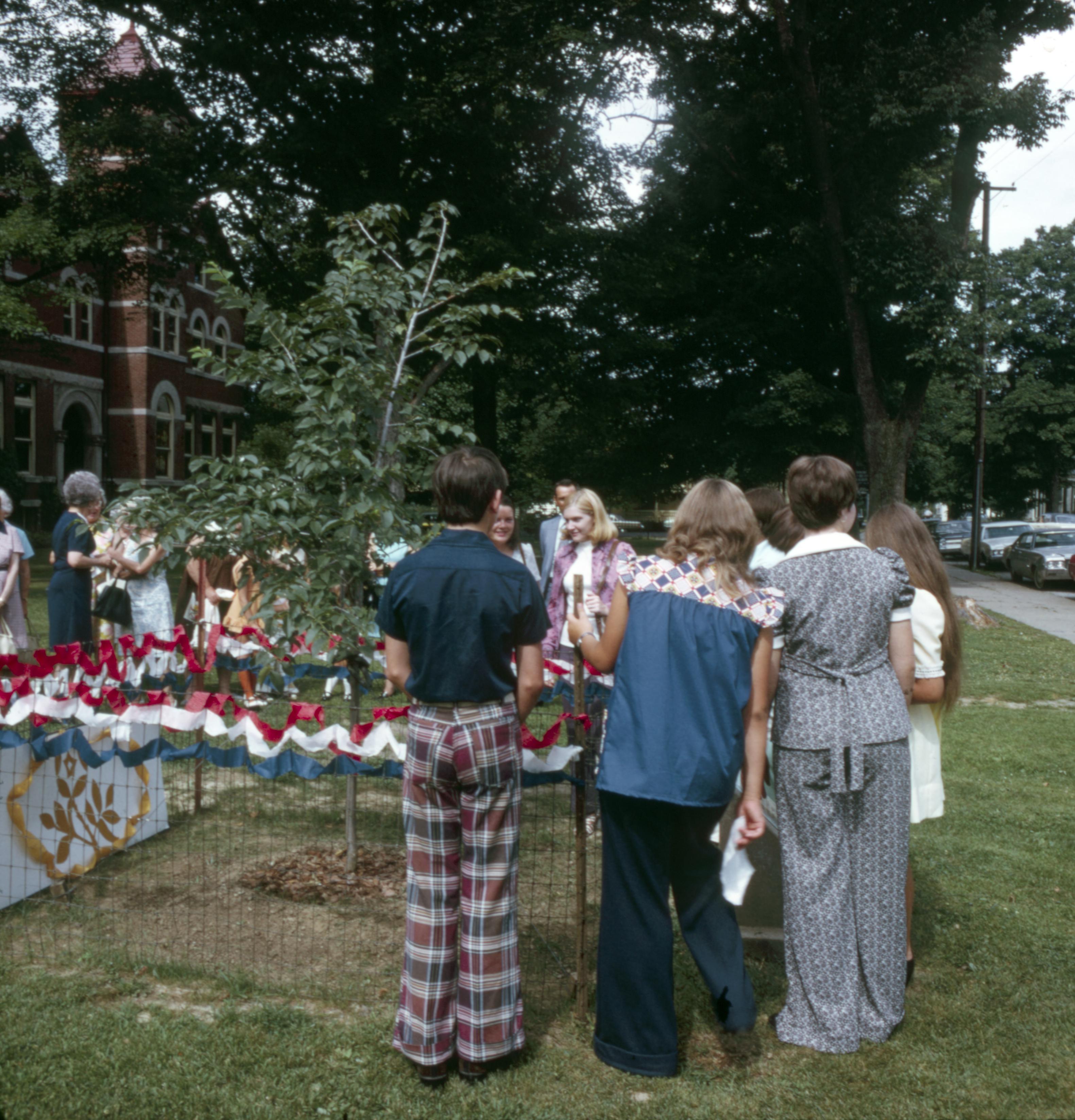 Guild Of Guides: The New Harmony chapter of the Indiana Junior Historical Society was called The Guild of Guides. The IJHS was formed in 1938 and this society had chapters, across the state of Indiana, which were formed by junior high and high school students who had an interest in historical things. The Guild of Guides produced a paper and photographs, in 1968, titled Architecture In New Harmony, Indiana, 1814 - 1969 which was published in a periodical produced by the IJHS. In this photo the group is standing, for the dedication of a tree, in front of the stone marker set at the front of Murphy Auditorium. This tree is still present in 2021 and is somewhat dislodging the stone marker.