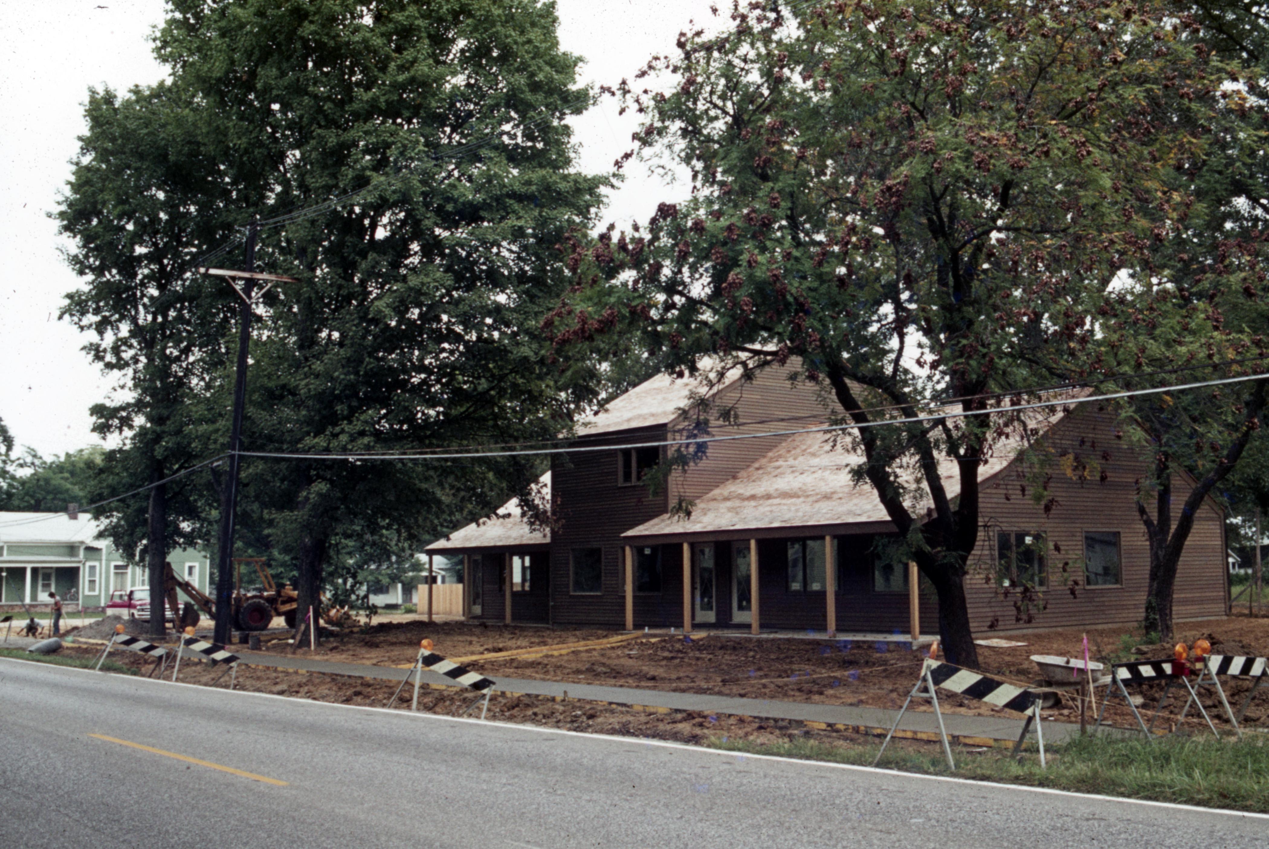 Lanark Development Collection: Construction of 820 Main Street New Harmony Indiana. Finishing the grounds surrounding the building. There are blue/purple spots on the photo in front of the building.