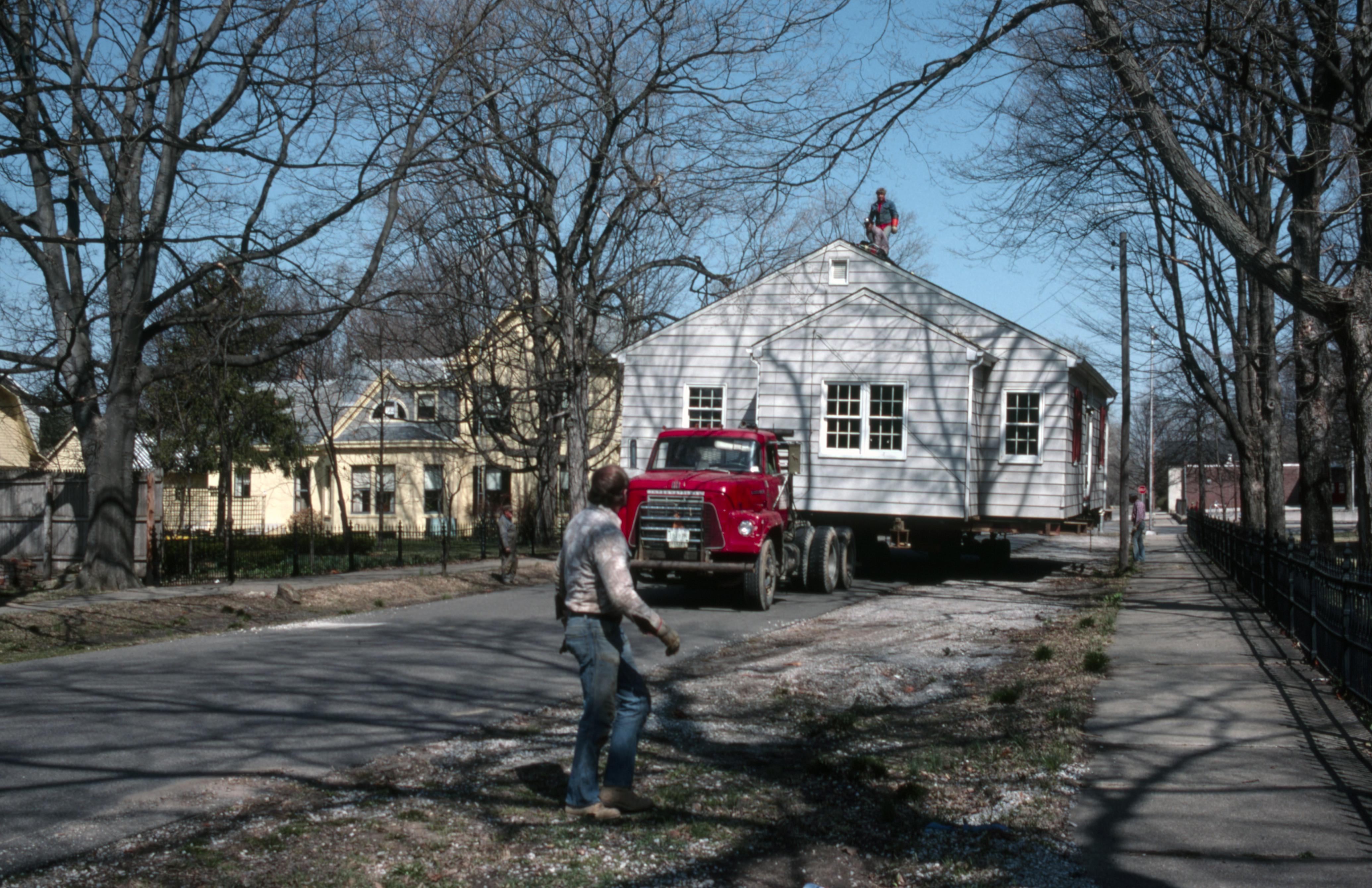 Relocations Collection: Fisher House. The Fisher House was moved from an area just north of the old Harmonist Cemetery to 715 West Street. Elmer Buchta Trucking Company was tasked with accomplishing this move as well as many other building relocations during this time. This photo was taken on West Street facing north toward Tavern Street. The large yellow house on the left side of the photo is located on the south west corner of West and Tavern Streets and is still present as of 2020. The Working Man's Institute is just out of sight on the right side of the photo.