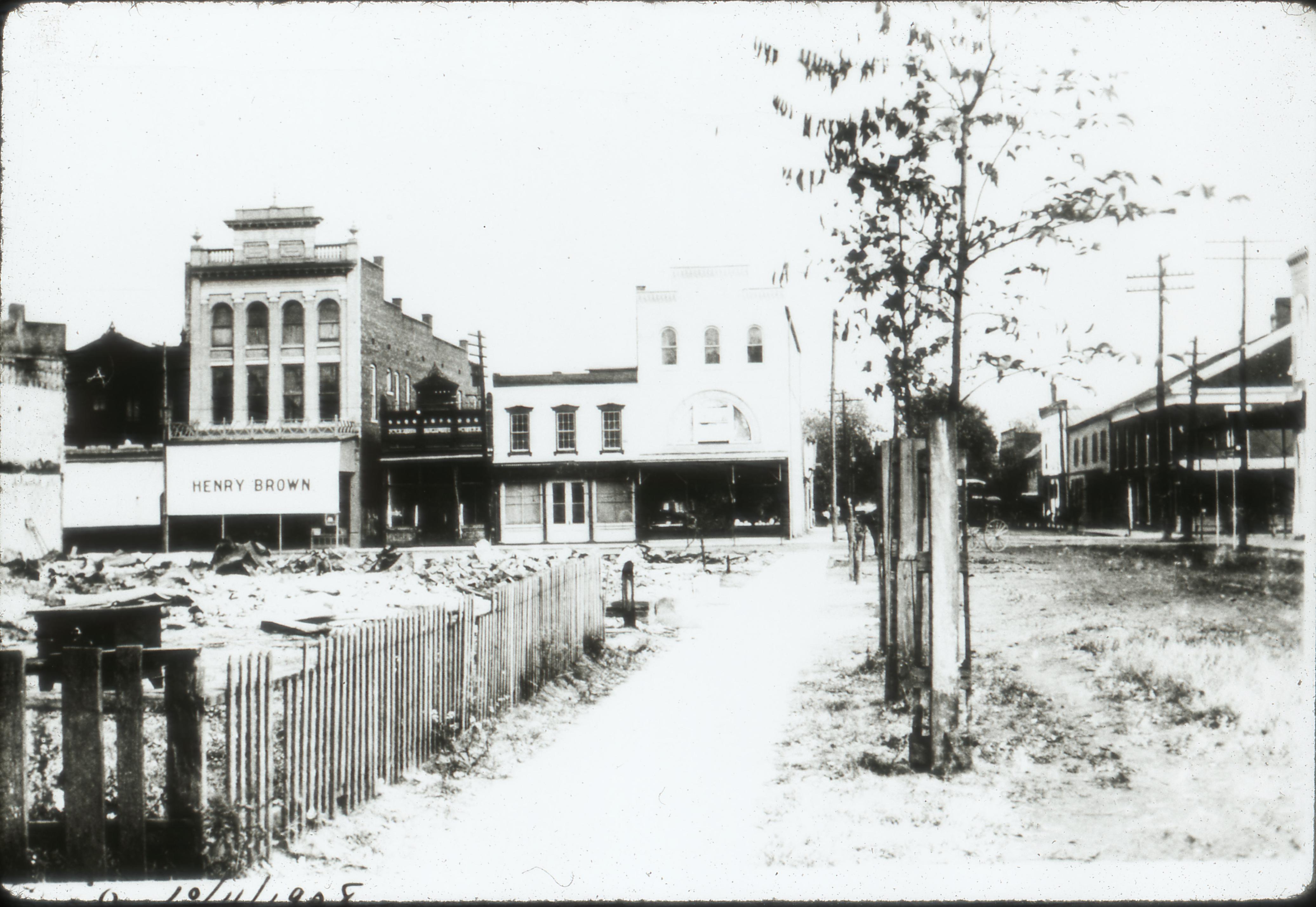 Streets Collection: Tavern Street. Historic Photo. This is a photo which was taken nearly 2 months after the August 17th fire that destroyed the Monitor Saloon, and several other buildings including a pharmacy, ice cream parlor, a butcher shop, Lyric Theatorium, a hardware store, New Harmony banking Co., and several residences. The fire occurred at the corner of Tavern Street and Main Street. From right to left the buildings still standing in the photo are: Harness and Express, Lichtenberger Furniture and China shop and third floor Masonic Hall, Lichtenberger Dry Goods and B & S, a saloon, Henry Brown clothing store and Knights of Pythias Hall on second floor, Grocery store and Hand Printing Shop on the second floor. Far left The burned out remnant of H. D. Long Bakery and Butcher Shop.