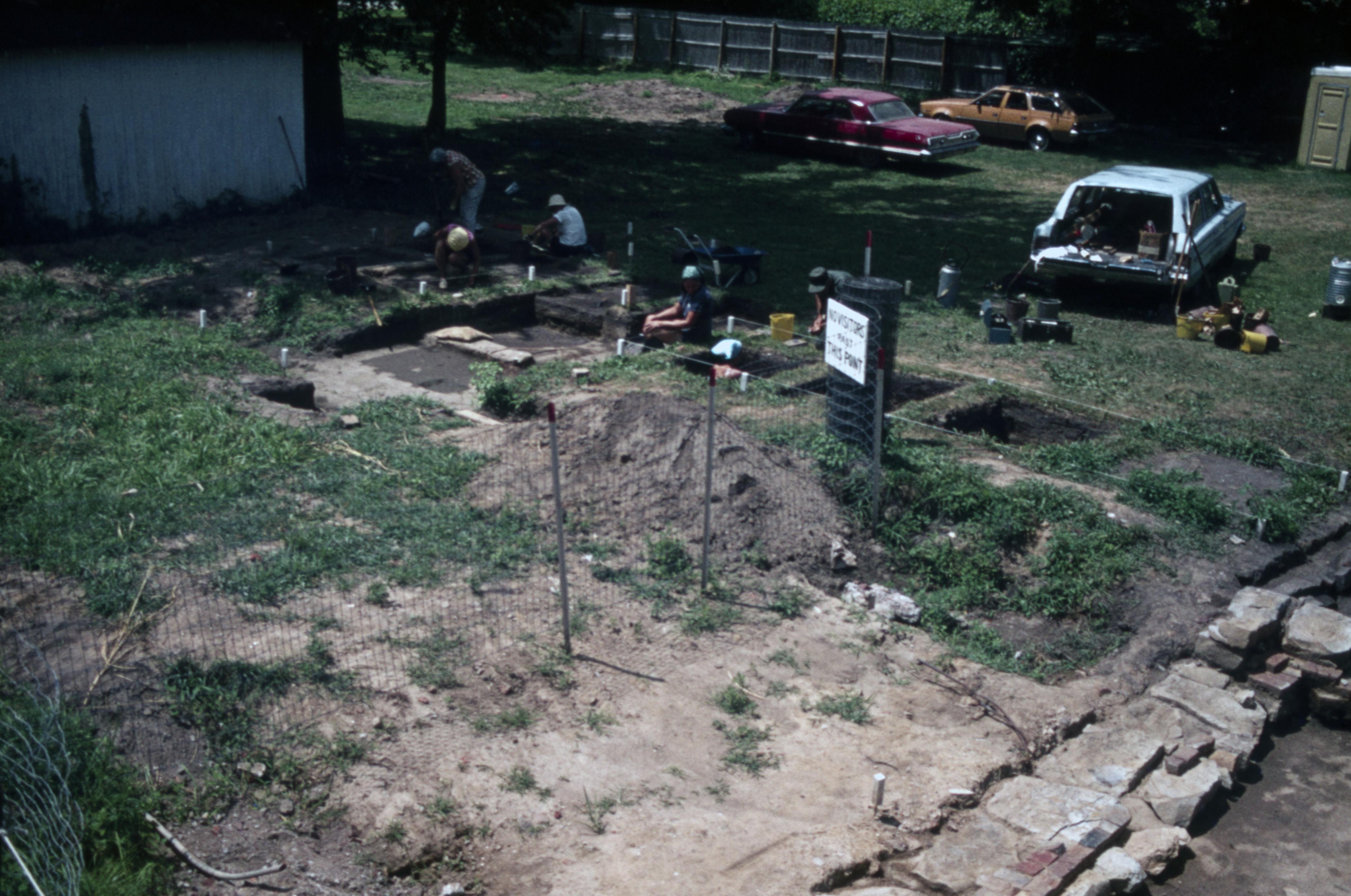 Indiana State University Evansville Archaeological Dig Collection: Solomon Wolf House. This dig site was located on South Street just east of 718 Main Street. This building was moved to 601 Granary Street for the construction of the Tree of Life Clinic. A group of people are working at the dig site.
