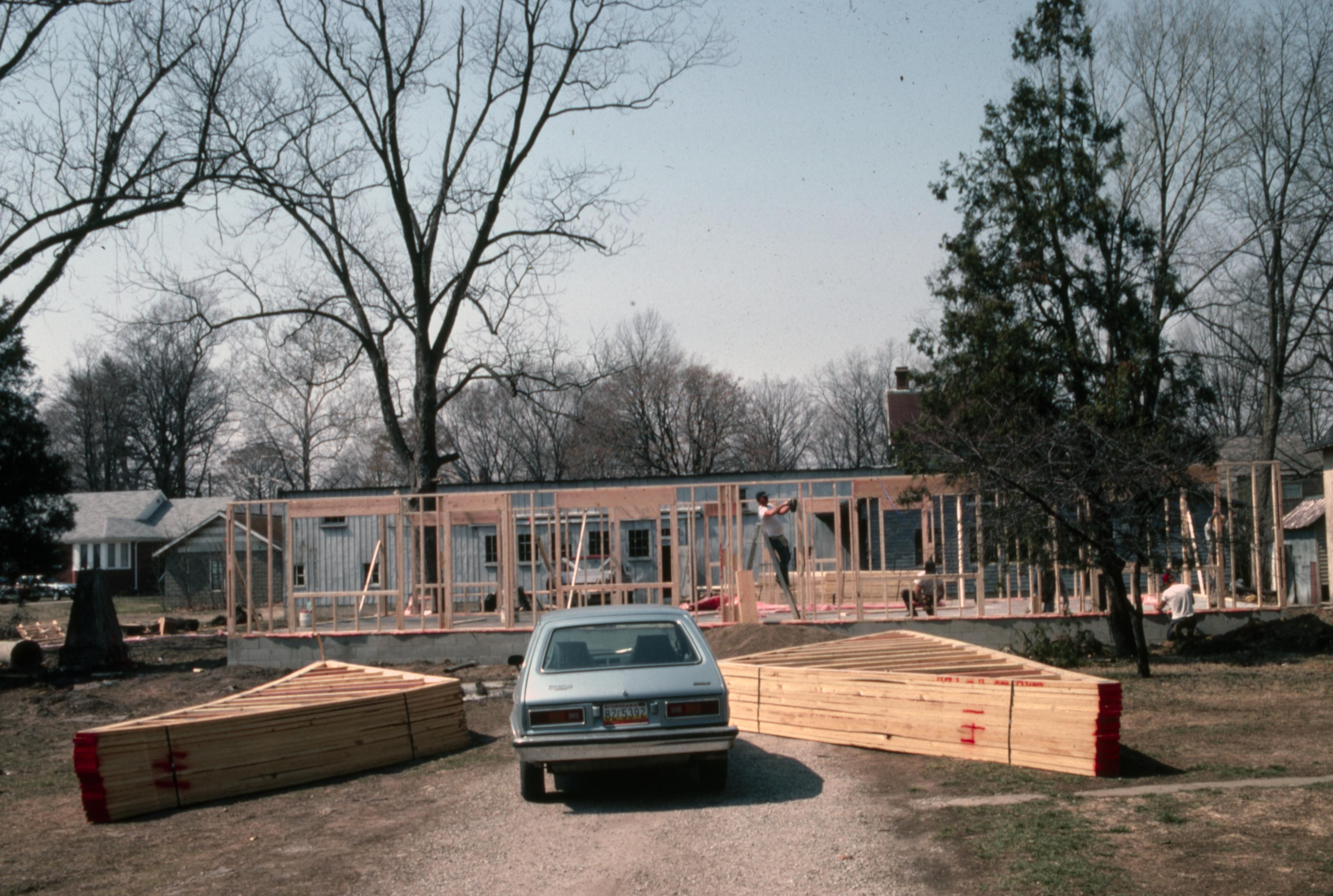 Duplex Built By N.H.N.: This building was constructed in front of the long metal building, which was demolished some time late, and faced Brewery Street. Workmen constructing the foundation and walls. The long metal building can be seen in the background.