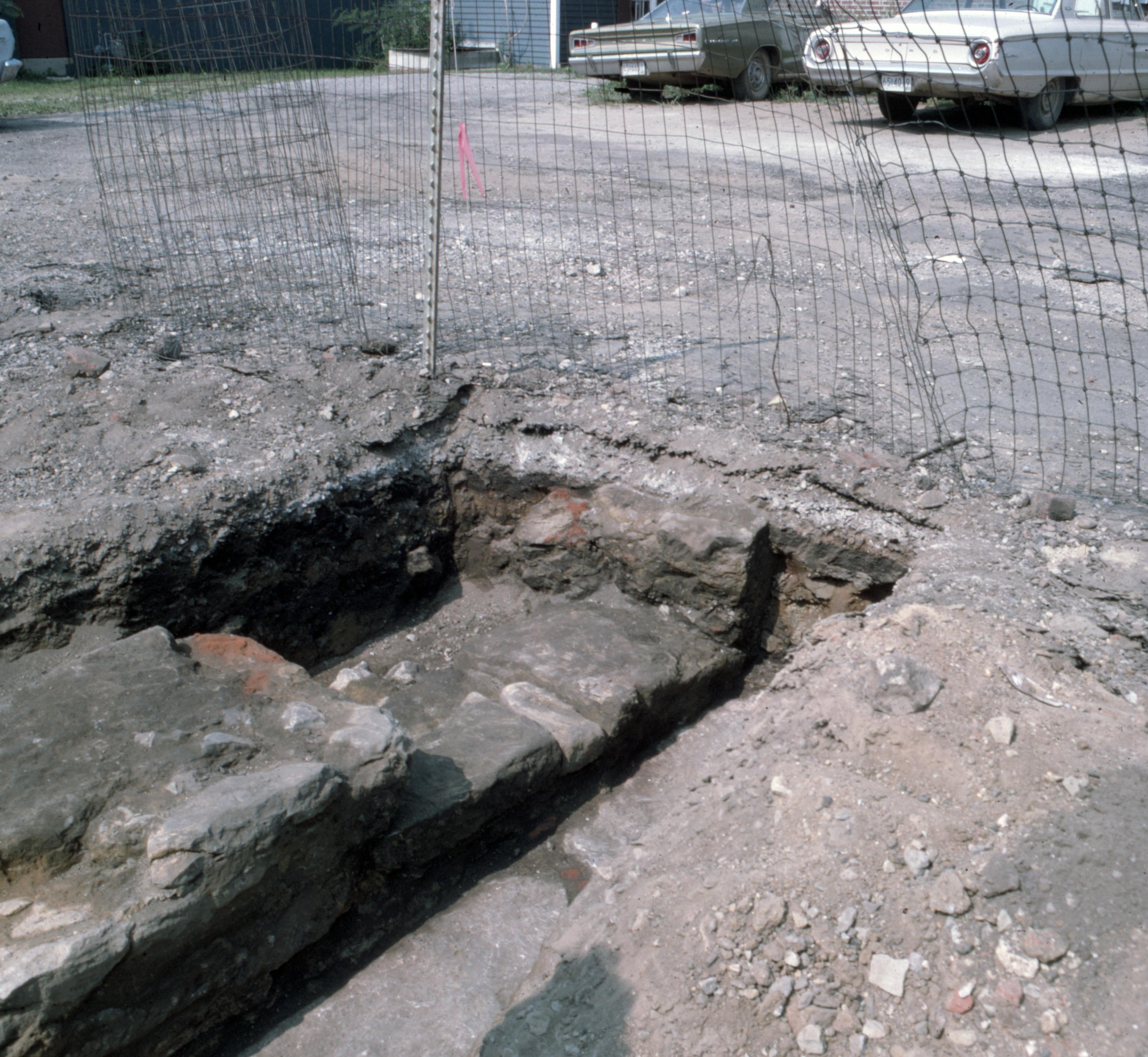Stone Warehouse: The Stone Warehouse was located behind the 602 Main Street building, which is now under a parking plat. This photo shows the archaeological excavation of the Stone Warehouse floor, this is part of the foundation.