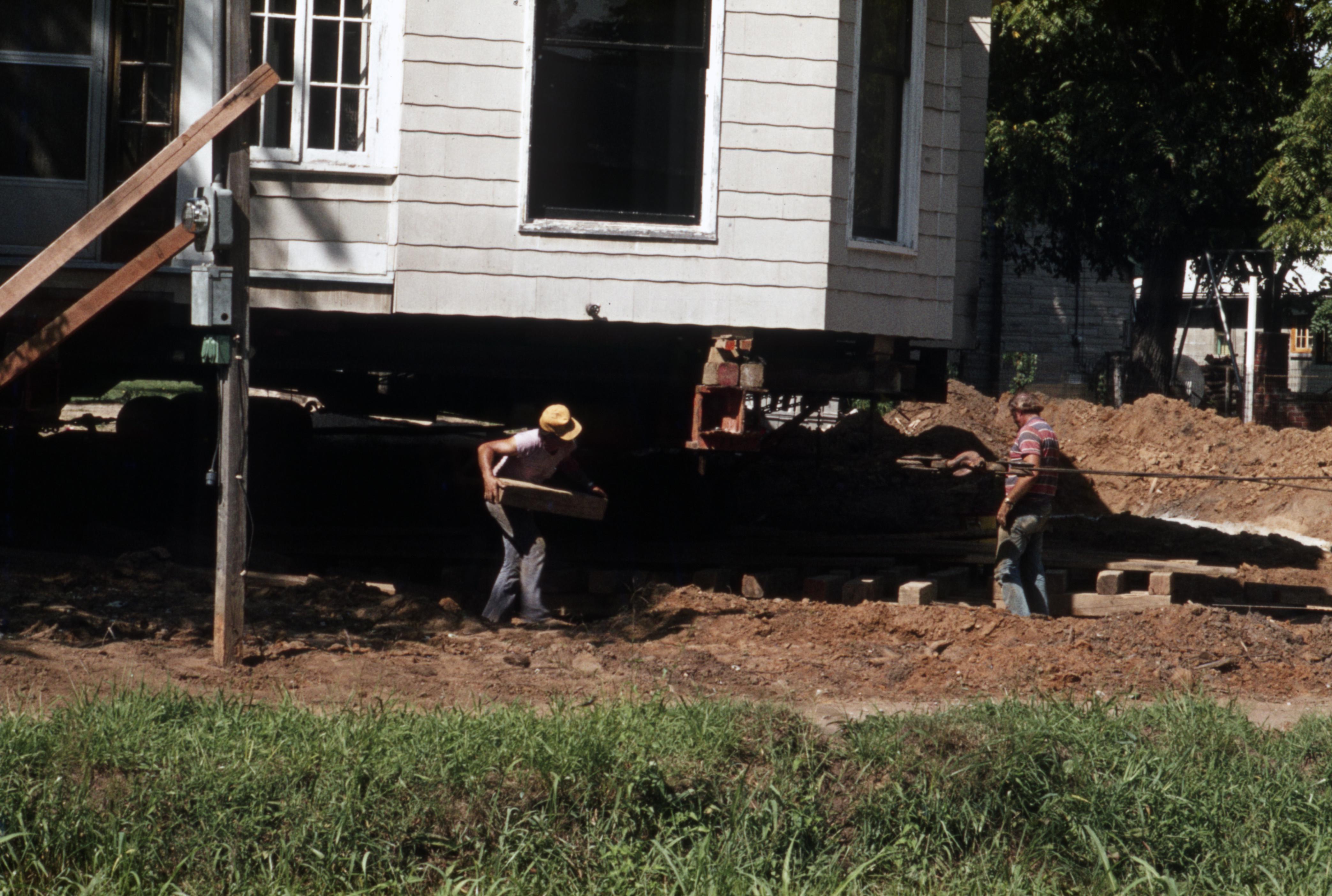 Barrett House Move: This house was originally located at 1826 Main Street but was then moved to 604 South Street during the Lanark Construction. Elmer Buchta were the movers. Workmen chocking the house into its place over the new foundations.