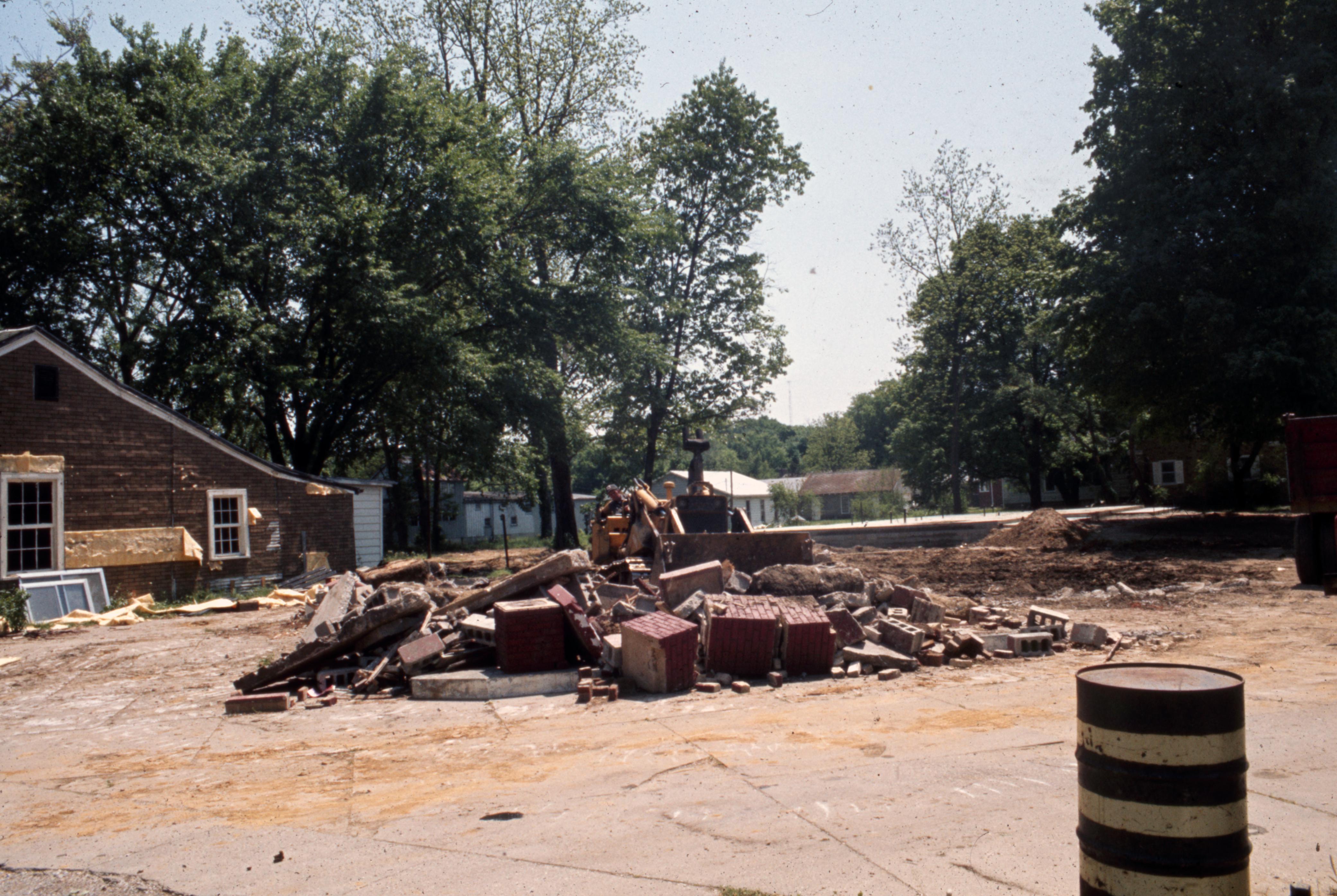 Lanark Development Collection: Buildings which were demolished during the construction of 820 Main Street New Harmony Indiana. Demolition of the red block building on the corner of Main and South Streets. This was E. E. Boyer's Service Station, which had replaced William Ford's Tobacco and Grain warehouse at some point after 1907 but before 1924. The building in the center of the background was moved to one block north of The Posey County News on 3rd Street, New Harmony, Indiana.