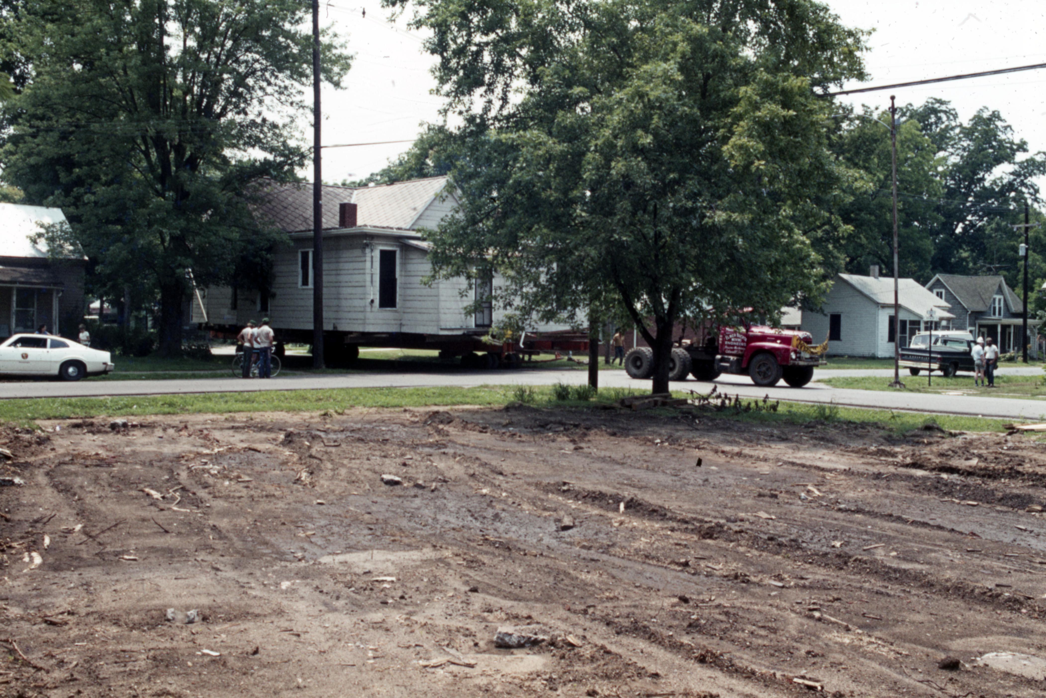 Barrett House Move: This house was originally located at 1826 Main Street but was then moved to 604 South Street during the Lanark Construction. Elmer Buchta were the movers. The house waiting to move forward onto the plat at 604 South Street. A group of people watches the move on the left side of the photo.