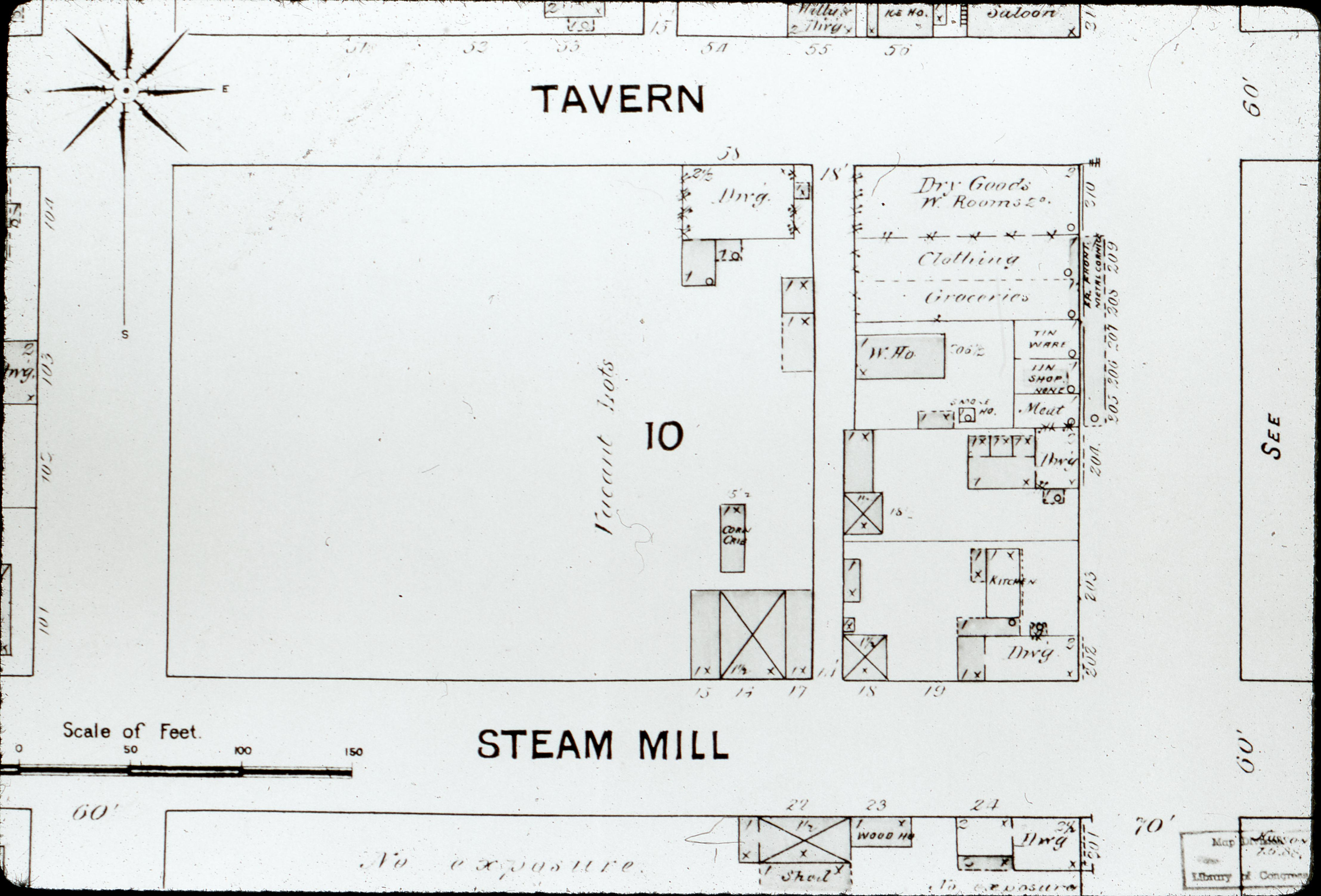 1888 Sanborn Fire Insurance Map: This map was produced by the Sanborn Fire Insurance Company in two sections and is the first known Sanborn Map of New Harmony Indiana. This map has some detailed information on commercial structures within the town but is a bit limited as the area covered does not include north of North Street, south of Steam Mill Street, west of West Street, or east of East Street. This black and white section is Town Block 6 - D.